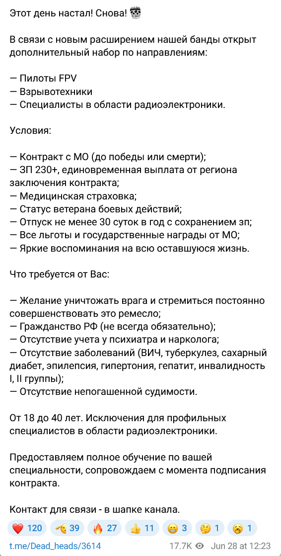 Куда пойти? Есть два стула, собственно заключение контракта на военную службу и в так называемый добробат. Лучше идти в добробат, там не платят региональных и МОшных миллионов за заключение контракта, проблемы с получением корочек убд и соответствующих льгот но зато ты свободный человек который служит только сколько написано в контракте https://rg.ru/documents/2022/11/08/document-federalnyjzakon419.html Заключая контракт на военную службы ты получаешь все эти два с чем то миллиона в Москве но служишь до смерти, или пока ногу руку не оторвало. Если хочется попасть в определенную воинскую часть или добробат то нужно в этой части запросить так называемое отношение, как получить и куда идти с ним спрашивай у вербовщика части или добробата, ну или иди на кпп части и спроси там как к ним попасть на службу. https://t.me/oxranahvk715 https://t.me/BTGR_NEVSKIY Москва больше всего платят https://доброволец.москва/ https://contract.mos.ru/ https://московскийполк.рф/ Кубань https://контракт23.рф/ Санкт-Петербург https://www.gov.spb.ru/contract/ Татарстан https://heroes-tatarstan.ru/ ХМАО https://voin86.ru/ Карачаево-Черкессия https://www.kchr.ru/svo/ Чтобы узнать подробности по выплатам можно загуглить собственно выплаты по регионам или позвонить напрямую в военкомат региона. Давайте очередной раз поговорим про деньги. Первое. С мобов и контрачей берут налог. Поэтому есть нефиговая разница между суммой до и после вычета. Вам по СМИ называют суммы ДО вычета, в целях заманухи и обманки. Мобилизованные в среднем получают около 170-180 000 рублей на руки. Это пехотинцы на разных должностях (от стрелков до пулемётчиков и командиров отделений). Артиллеристы, танкисты и разведчики получают около 190-210 000 рублей, но их меньше, чем пехоты. Связисты получают 186-200 000 рублей. Это мобилизованные, без учёта региональных выплат, как в Москве. Мобы-москвичи получают +50 000 рублей. В сумме около 220-245 000 (градиент от пехоты до арты и танкистов, которые зарабатывают больше других). Главное достоинство мобилизованных — в России они получаем ту же зарплату, что и в Зоне СВО. В отпуске, находясь в госпитале. Это удобно. Например, тебя ранило, с тебя сняли форму, пропитанную кровью и грязью. Тебе нужна новая при возвращении в строй. Берёшь и покупаешь. И заодно про*ную экипировку, аптечку и прочее, что растерял из-за ранения.
