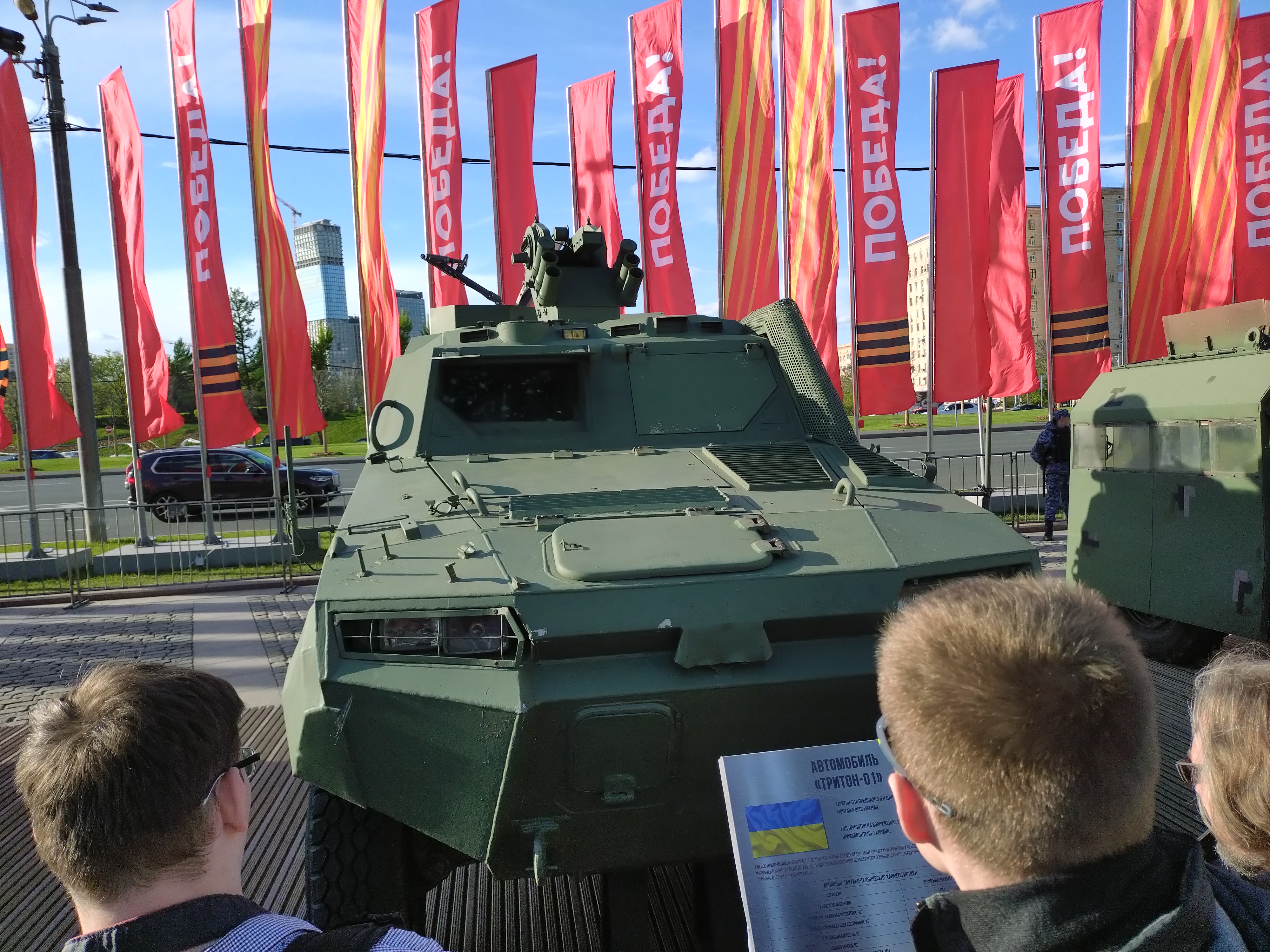 Кроме в хлам разъёбанного Абрамса и выгоревшего изнутри МРАПа техника с виду целая. На многих машинах треугольники, т.е. это брошенные машины из-под Курска, захваченные уже после старта московской выставки.