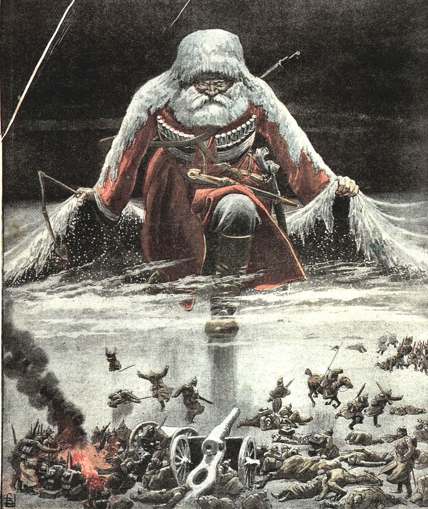 Вы просыпаетесь в продирающейся сквозь подлесок Газели. Выбиваемые стёкла хрустят аккопанементом к треску отлетающих колёс. Вскоре сила инерции заканчивается, машина прекращает безумное движение. Каким то чудом вы остались живы. Вы даже почти не пострадали. Сквозь проёмы стёкол светит луна. Над салоном нависают кроны сосен. На переднем сиденье вместо водителя почему-то лежит туша здоровенного животного с разветвлёнными рогами. Пассажирка, сидевшая ближе всех к выходу, распахнула заднюю дверь микроавтобуса. Выбралась наружу. По пикающему звуку стало понятно - женщина набирала номер на мобильном телефоне. Со стороны дороги, вы видите приближающуюся двухметровую фигуру. Фигура закутана в просторные красно-белые одежды. Из под высокой шапки сверкают красные глаза. В руках незнакомец держит громадный посох. Великан одним взмахом посоха снёс пассажирке голову, захохотал громовым смехом. Действительно, зачем женщине голова - связи то в этом лесу отродясь не ловило. Искорёженная дверь на некоторое время замедлила атакующего - он не смог протиснуться в узкий проём со своим огромным посохом. Отступил, насадил оторванную голову на посох и принялся размахивать ей. Лучшая игрушка - на палке черепушка.