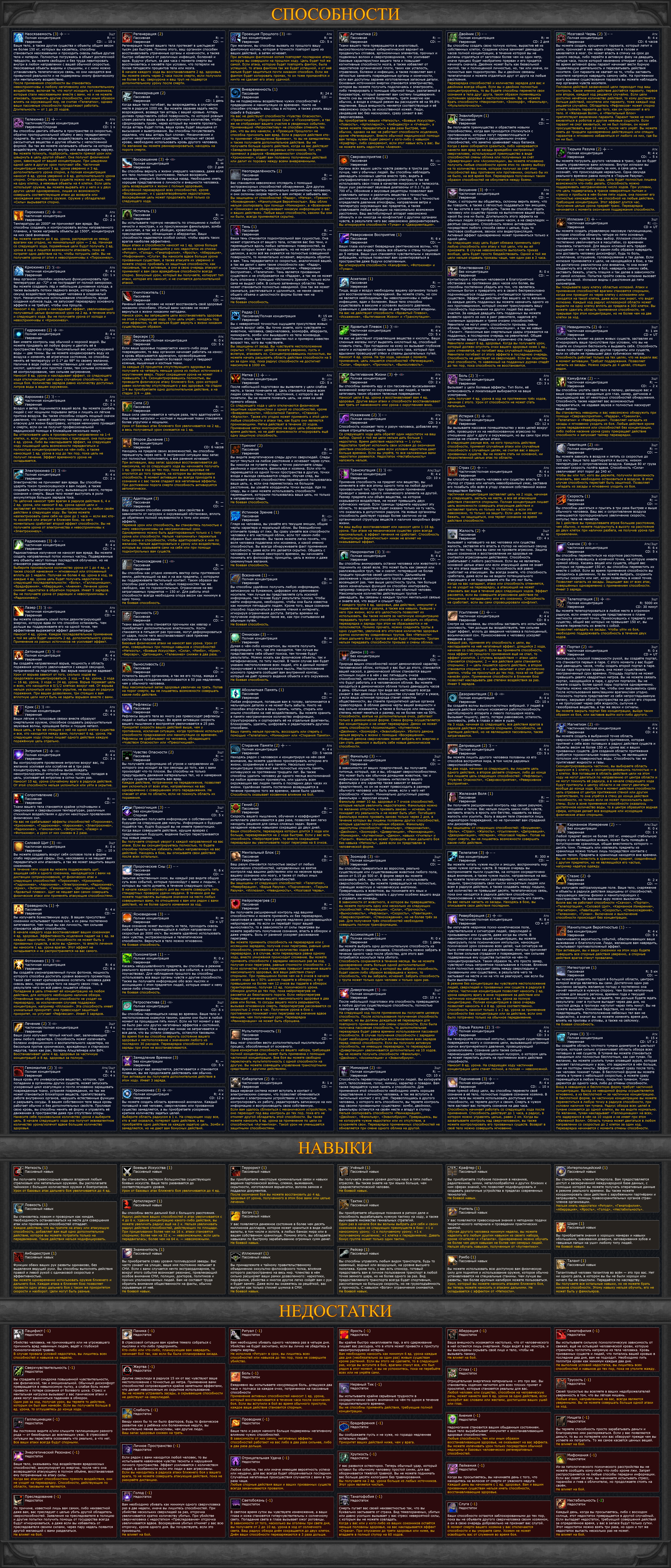 Изначально у каждого персонажа есть 10 очков для выбора способностей, расширить которые можно взяв от 1 до 3 недостатка, каждый из которых даёт 1 очко (ВАЖНО: недостатки всегда превалируют над способностями)