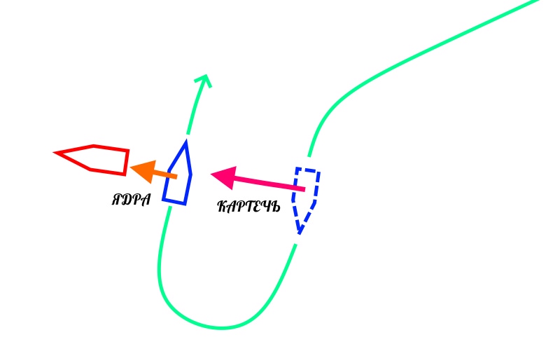 Я не знаю силу и направление ветра, нашу скорость и курс относительно галеона, и надеюсь никто этого не знает, знать не хочет и выяснять не станет, потому что у нас игра буквами на дваче, а не военно-морской симулятор. Я опишу общую конфигурацию маневра в предположении, что он реализуем без критуспеха.