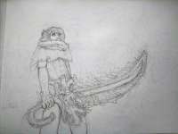 Hiramune lit. Flat Core is Ghislaine's weapon, given to her by Gal when she became Sword King and is one of the Sword God's seven swords that she sheathes by her left hip and usually uses forward grip style in fighting. Hiramune is a katana with a dark colored back side and patterns by its reddish edge side. The golden cross guard also serves as a blade collar but it is longer on backside and as it crosses to the edge side. The dark hilt is slightly curved and has a golden pommel.