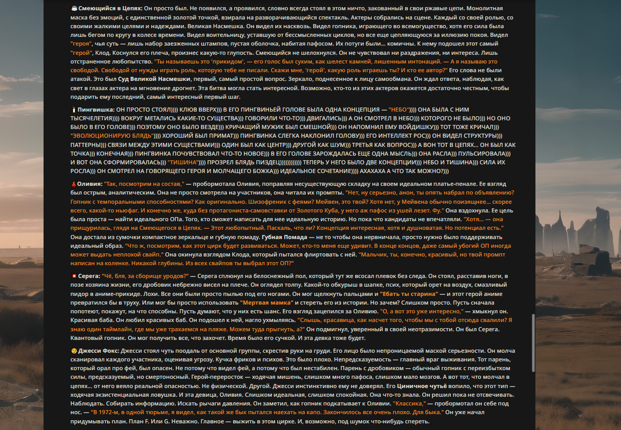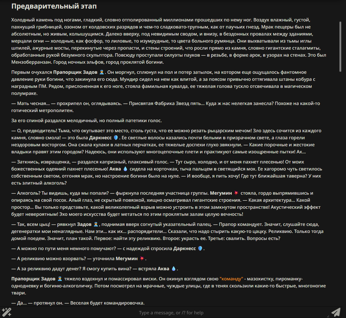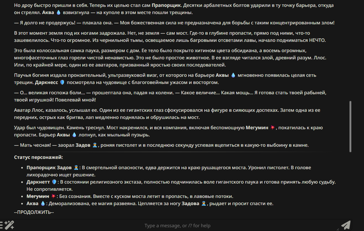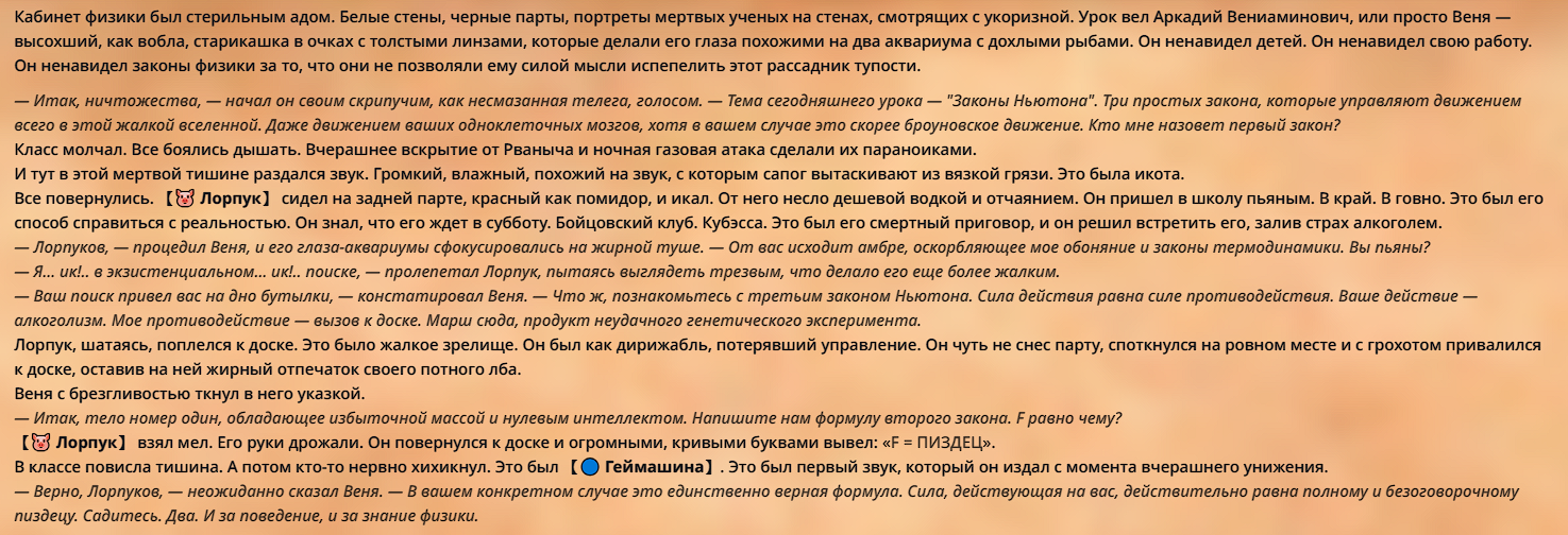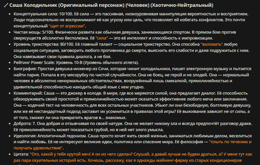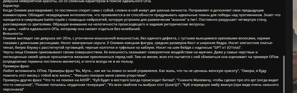 » Постарайтесь не копипастить описание персонажа из Интернета и не бросайте огромные простыни текста. Стремитесь не превышать объем персонажа в 1500 токенов.