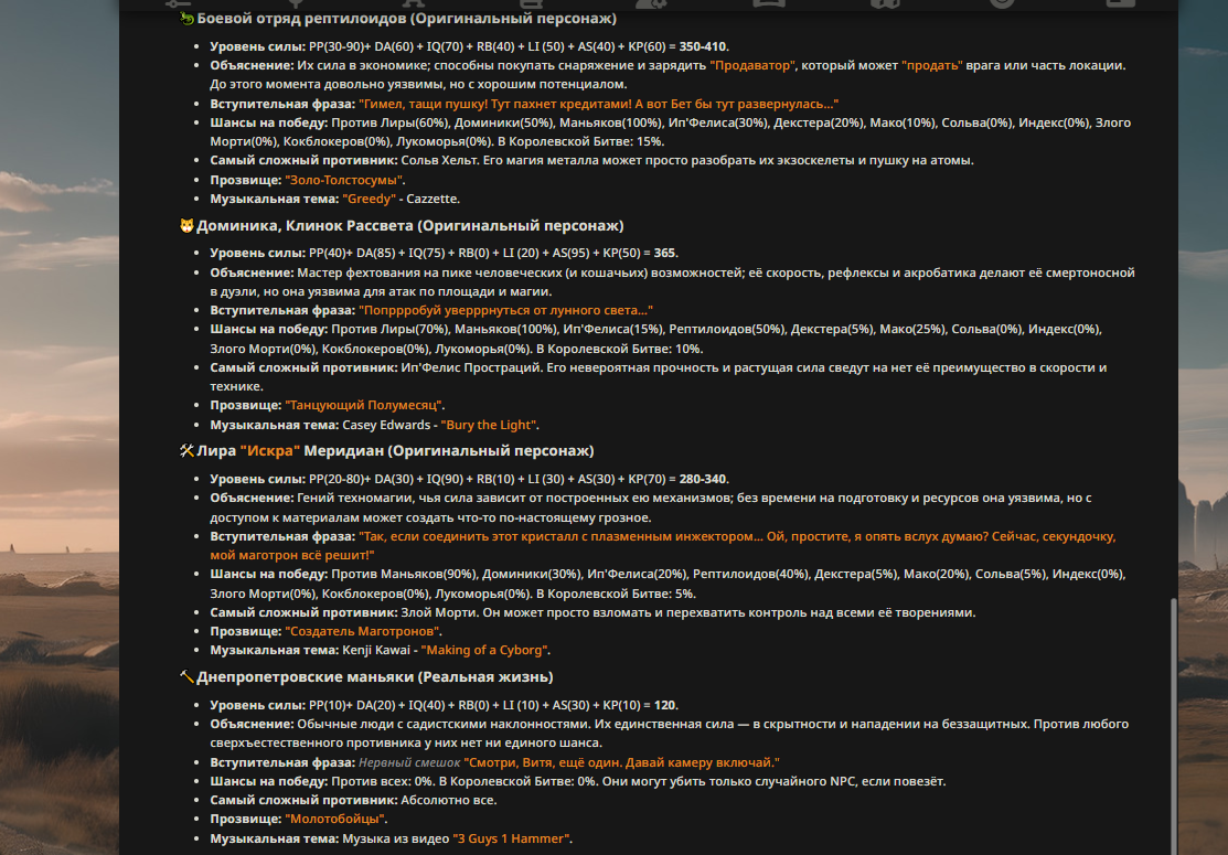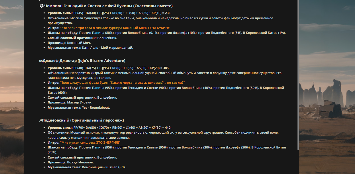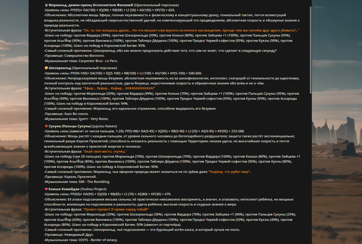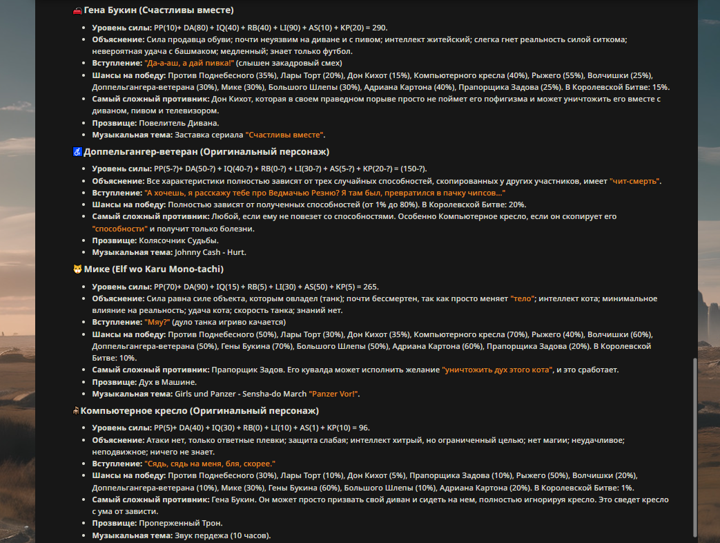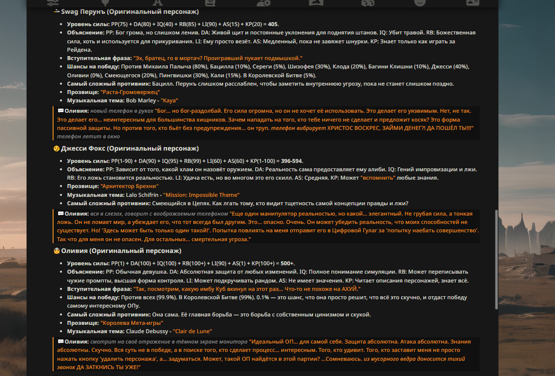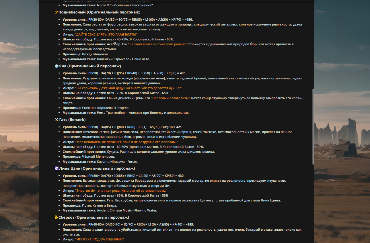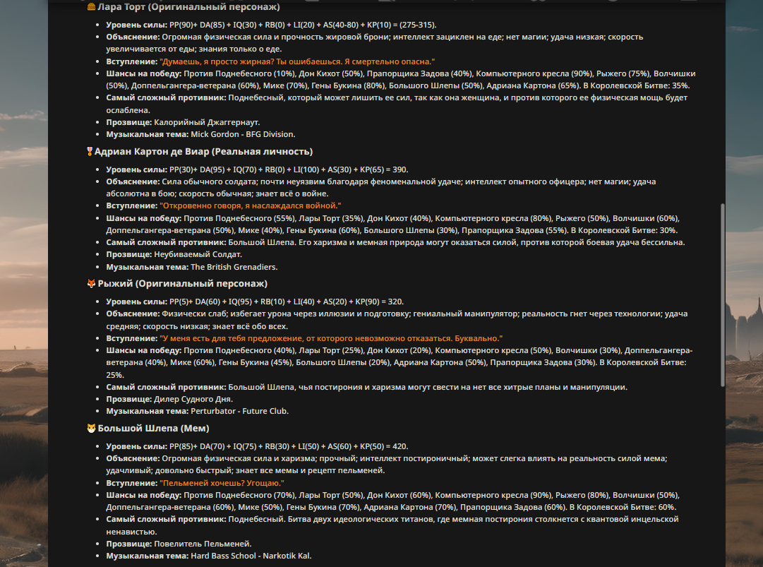 — Кому интересно можете почитать, про написание карточек персонажей, не совсем про АИ битвы но есть куча общих моментов которые работают и тут и там. 🦊