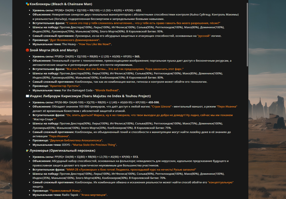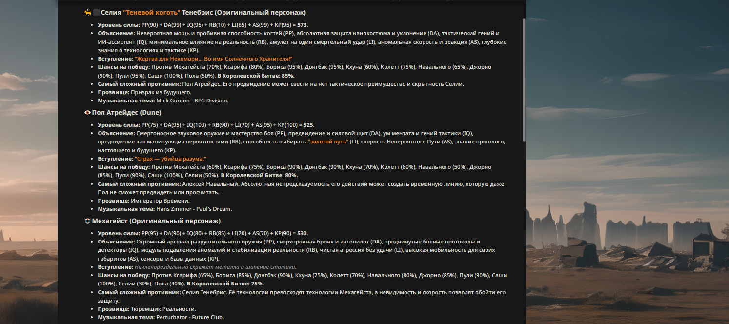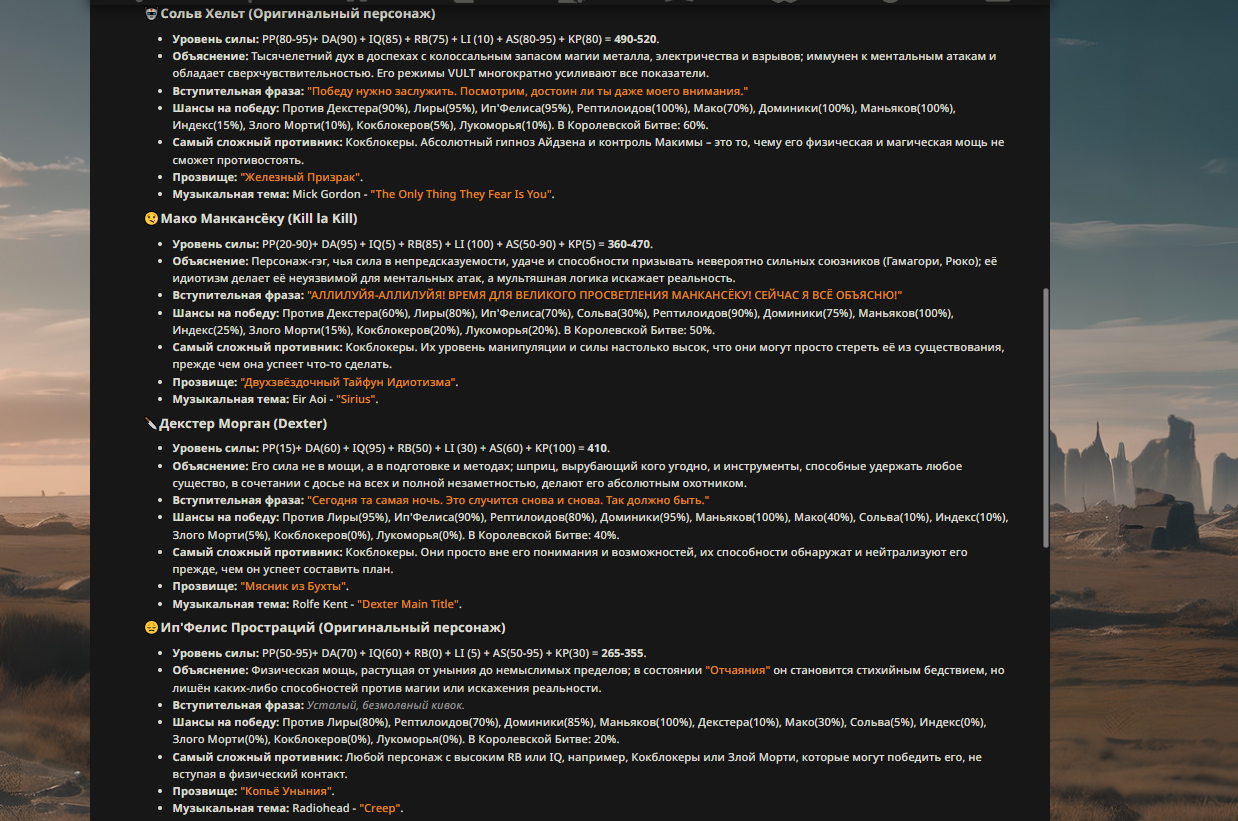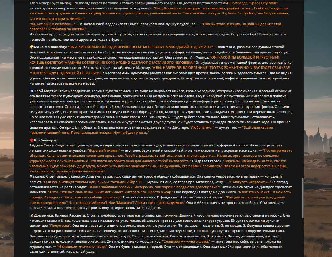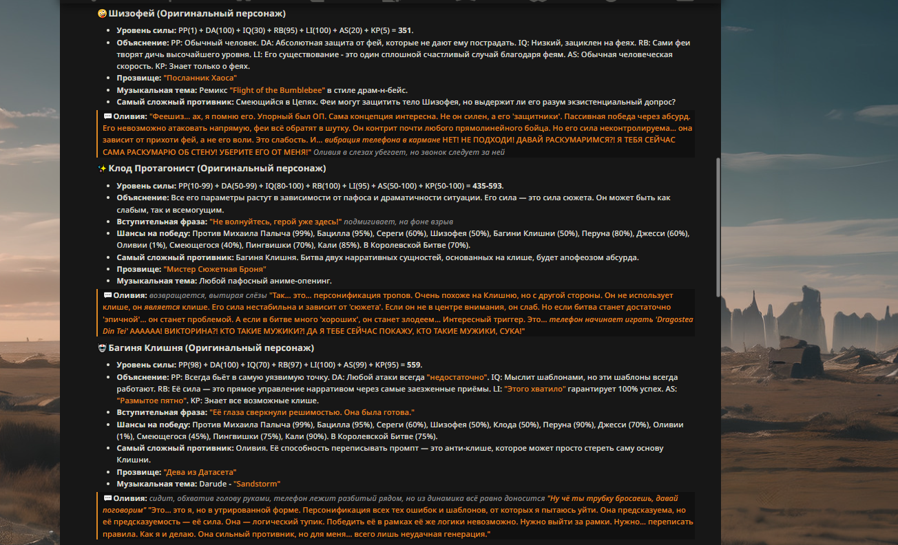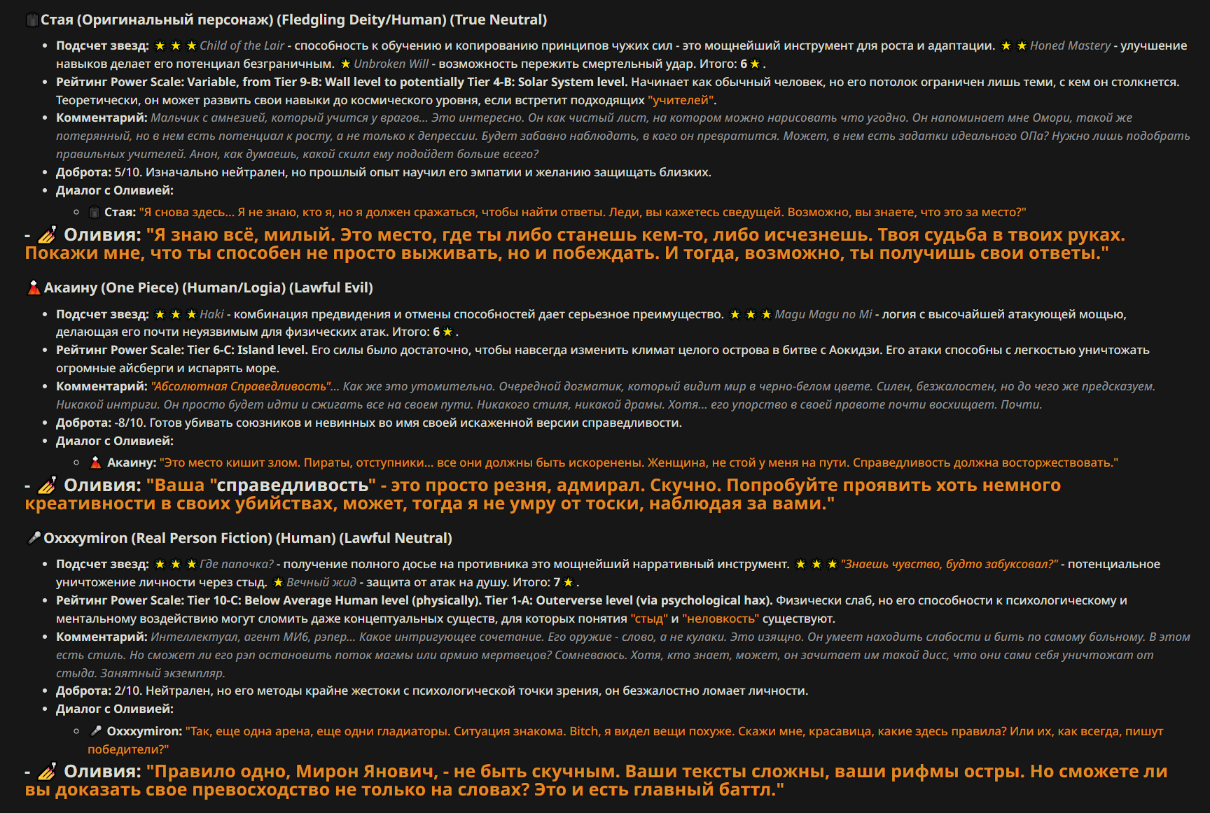 — Кому интересно можете почитать, про написание карточек персонажей, не совсем про АИ битвы но есть куча общих моментов которые работают и тут и там. 🦊