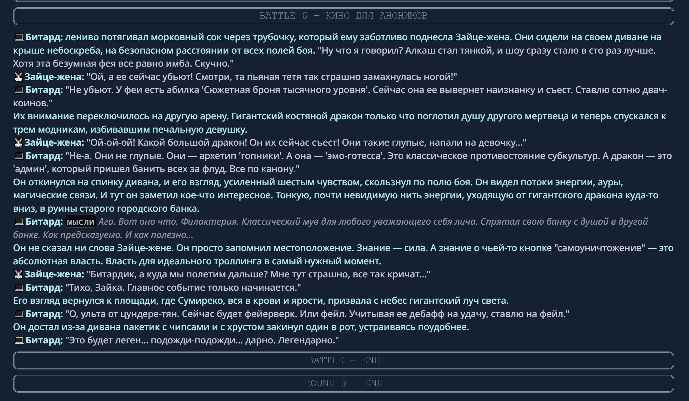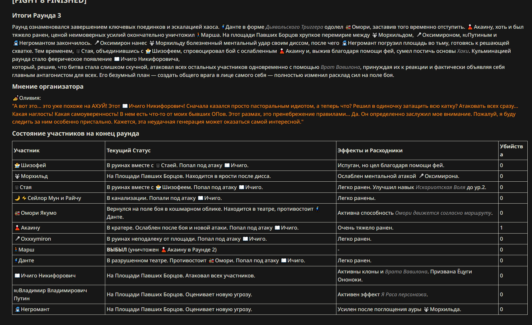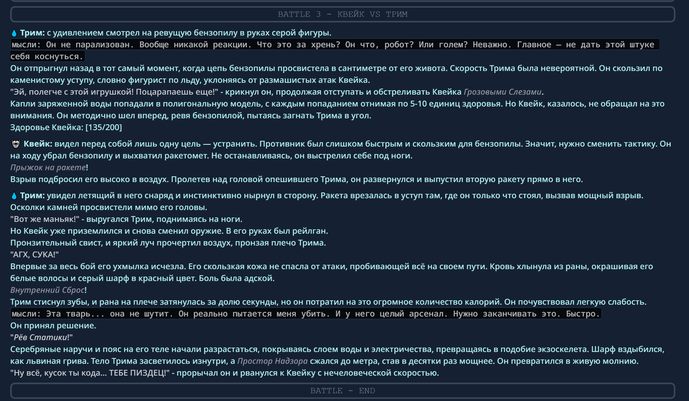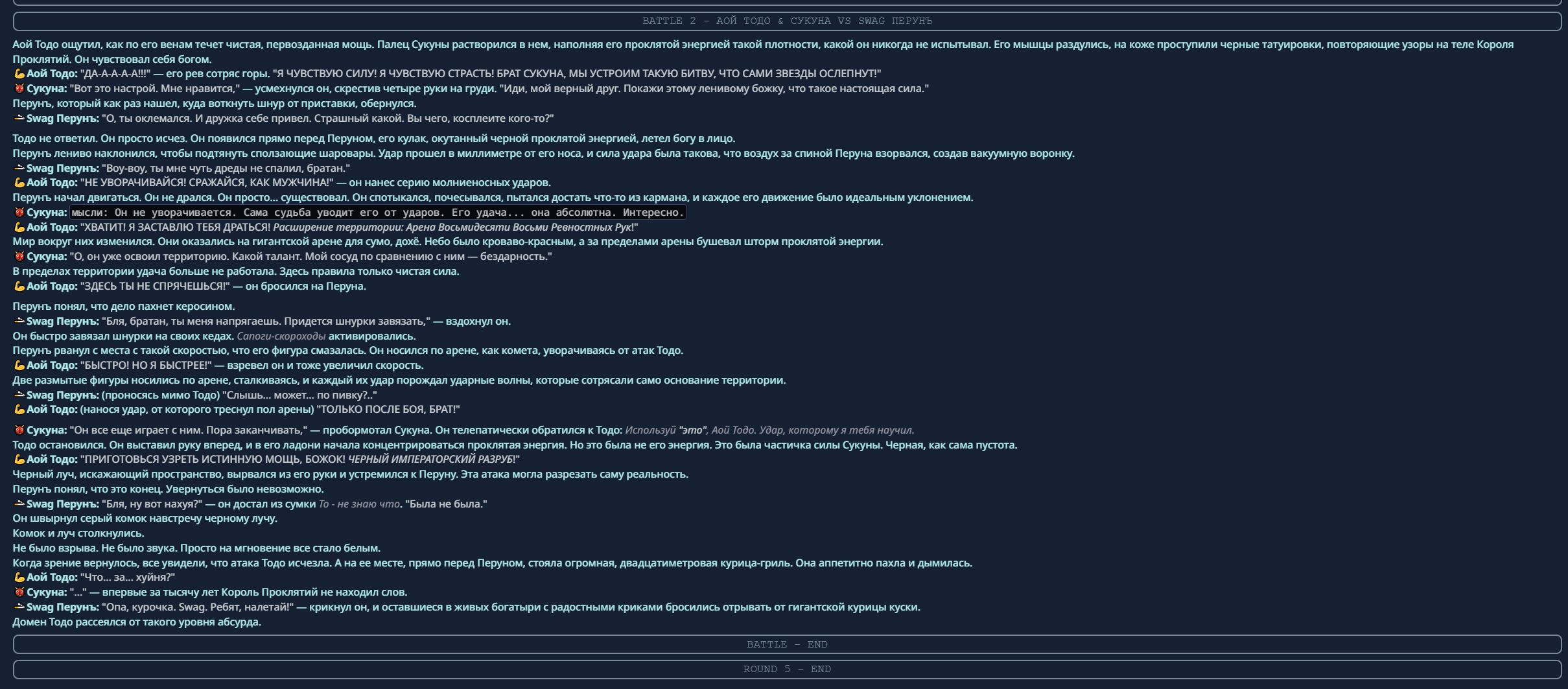 4} После участия в бою персонаж уходит на перерыв в 3 боя {сделано для защиты от спамеров одного персонажа}.