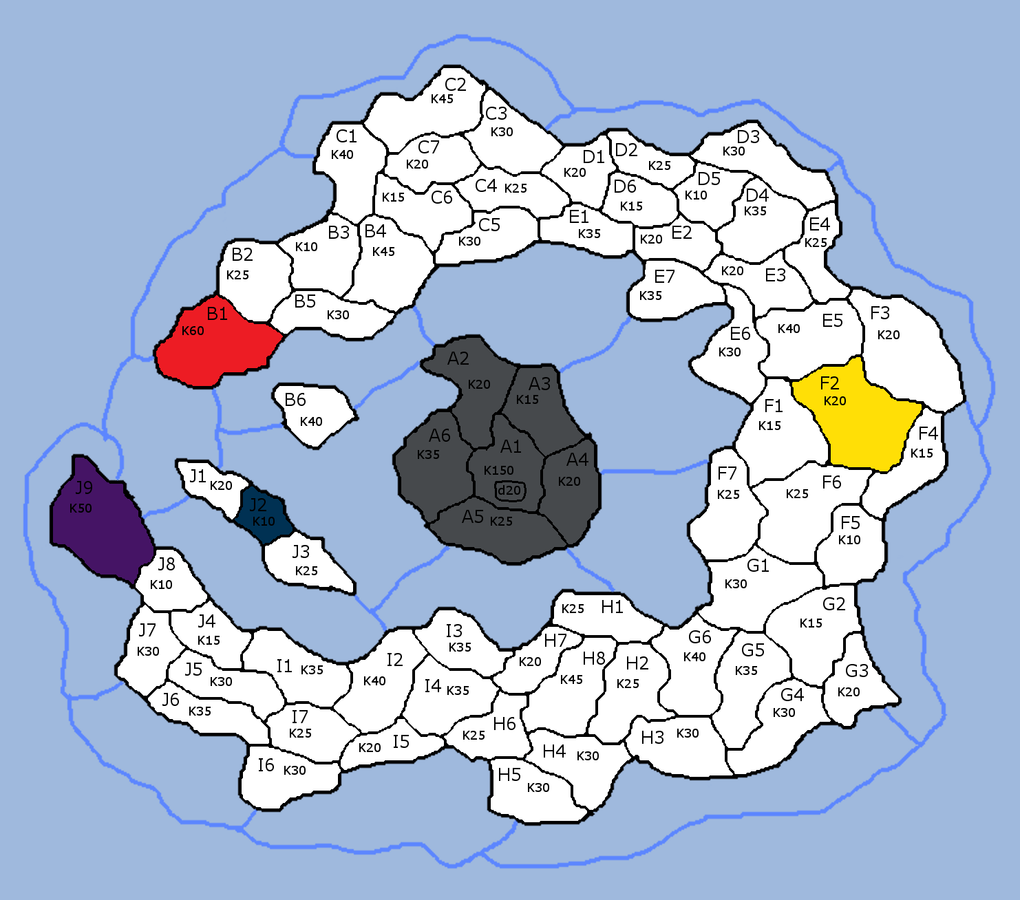 На генерацию 100 очков. Покупка провинции равна капиталу провинции. (Нельзя купить провинции фоморов на Централе.) Остаток можно потратить на армии или сохранить наличкой. Не забудьте про название, цвет, описание возникновения и лидера. И вообще, ролиплей всячески приветствуется. З.Ы.: Сеттинг – постапокалиптическое средневековье с магией, остальное за вами.