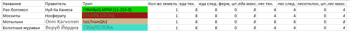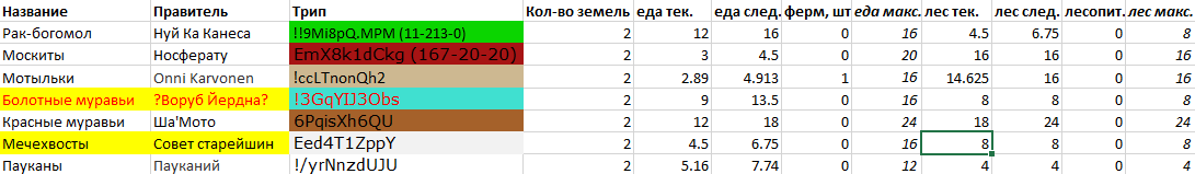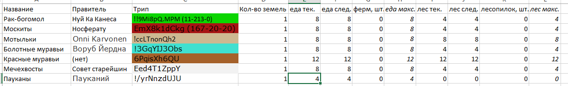 Удобно быть летающим в джунглях, не так ли? После вероломной атаки передовой отряд Красных уничтожен и высосан досуха... Хотя гемолимфа и плохо подходит для такого. Атаковавшие самки, тем не менее, понесли вполне ощутимые потери - следующий бой может стать для них последним. А может и не стать - загляните в обсуждач, я слегка поменял правила боя. Королева отреагировала на это вполне логично - заложив чёртову тучу новых яиц. Тем временем кровь, которую пили принцессы-учёные, была, похоже, несвежей. Пережигание дерева на более эффективный древесный уголь пока почти никак не двигалось, а вот календарь, хоть и не без некоторых трудностей, но изучили. После прирастания: еда 2, лес 16. Личинки ничего не едят. Боже, как я это пропустил.