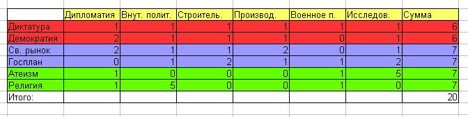 Не знаю стоит или не стоит внедрять контрразведку и шпионаж? а так же не знаю стоит или не стоит ставить ограничения на лимиты ходов для диктатуры и демократии, атеизма и религии, госплана и свободного рынка и т.д.
