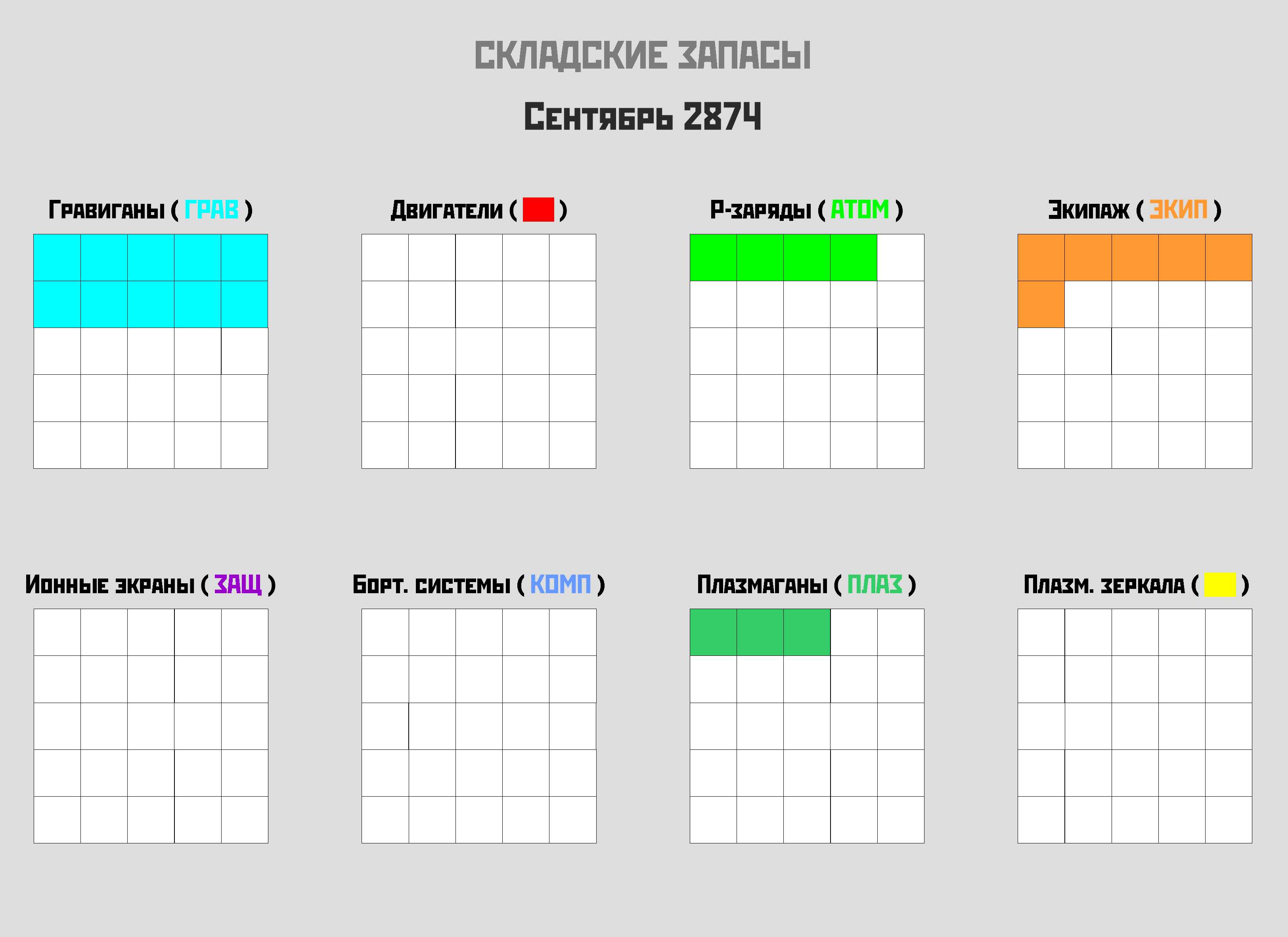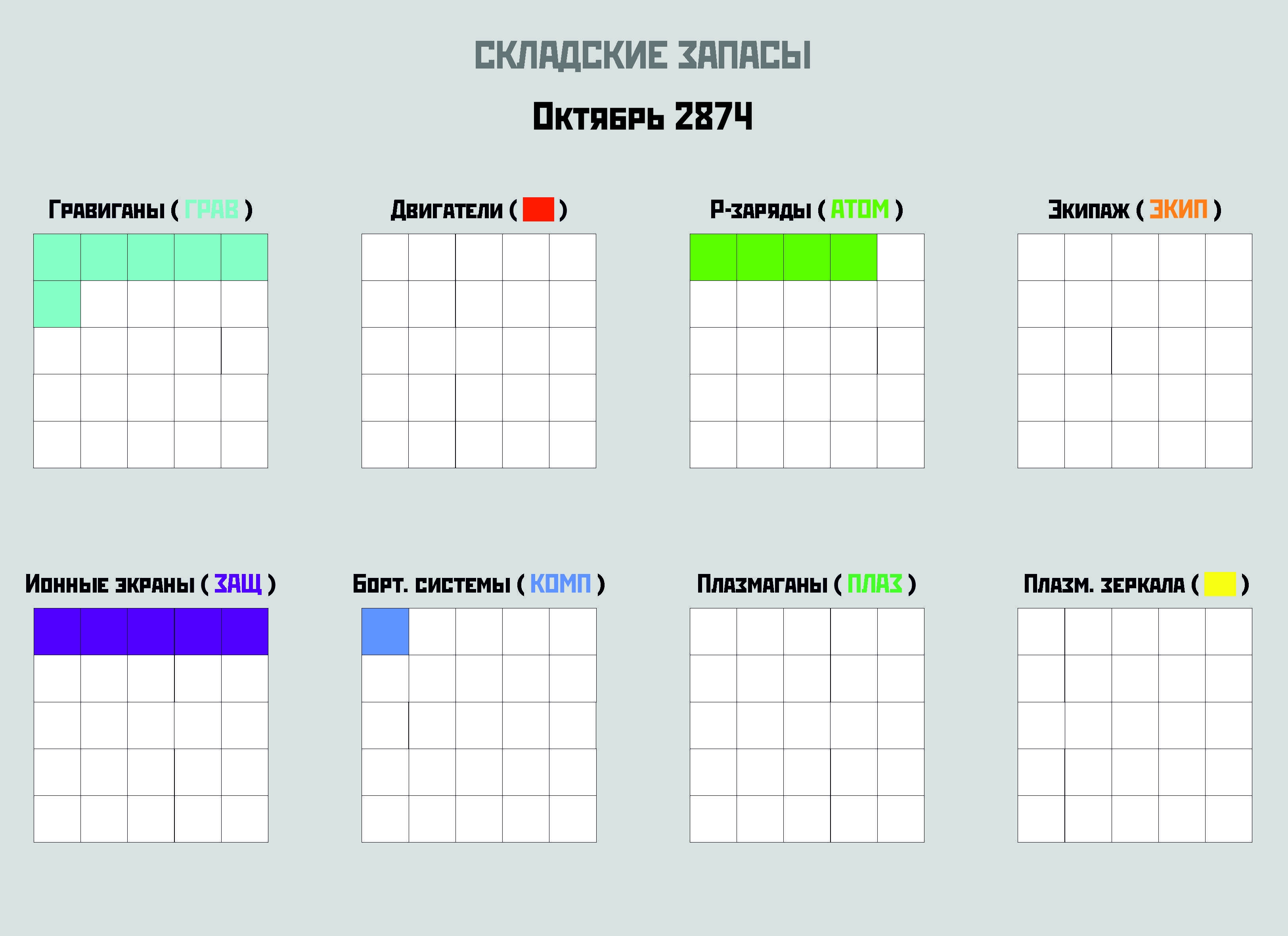 Итак, наступает октябрь 2874. Этот месяц тоже нужно как-то вить без бюджетного финансирования, зато в ноябре придут КБ за 3 месяца сразу. Текущие задачи: 1. До конца нынешнего хода (октябрь 2874) укомплектовать 4 строящихся эксплорера оборудованием и экипажами. 2. В течение 5 ходов (март 2875) достроить крейсера "Сыч" и "Канюк", желательно с итоговой БМ=10+ (что подразумевает проведение одного или нескольких исследований для левел-апа комплектующих).