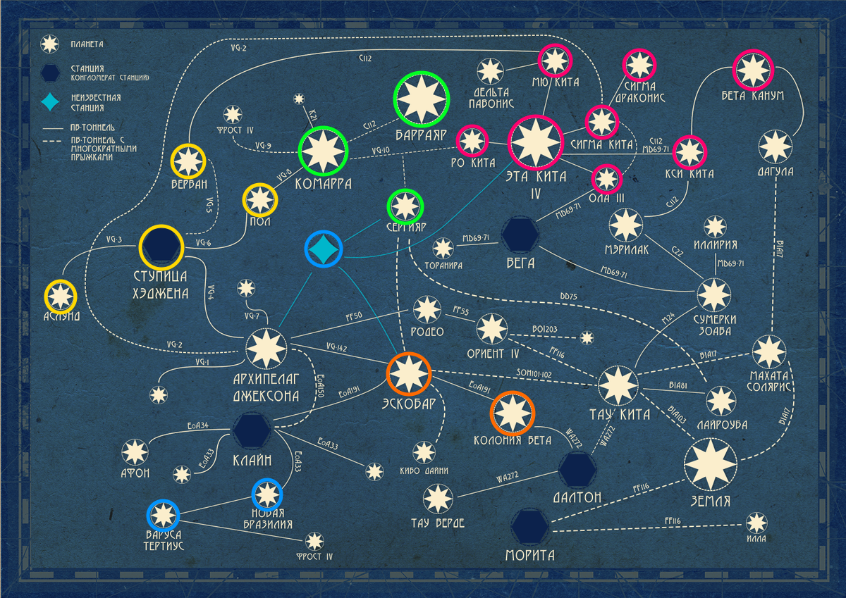 На одном гксе может быть сколько угодно кораблей, но я считаю что лучше ограничить число до 10-20, зато на картах планетарной системы можно разгуляться. См. картинку, я могу так для каждой системы сделать: в каждом гексе кроме звезды, планет и спутников может быть космический корабль, за планетами можно прятаться, за астероидами тоже, но если между кораблями нет препятствий то можно валить друг друга, ограничений по дальности ведения огня быть не должно, ну если только для ракет и бомб?