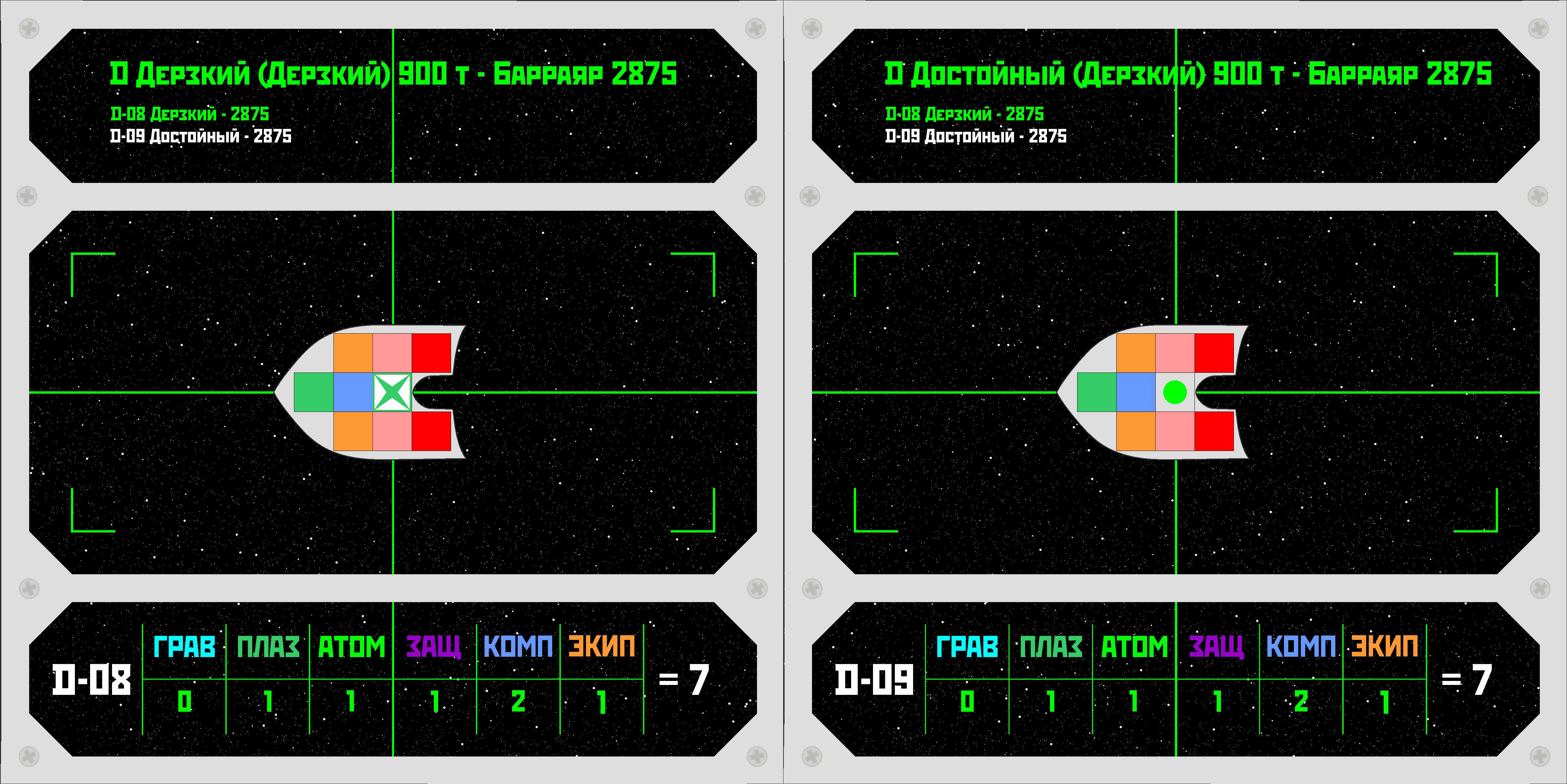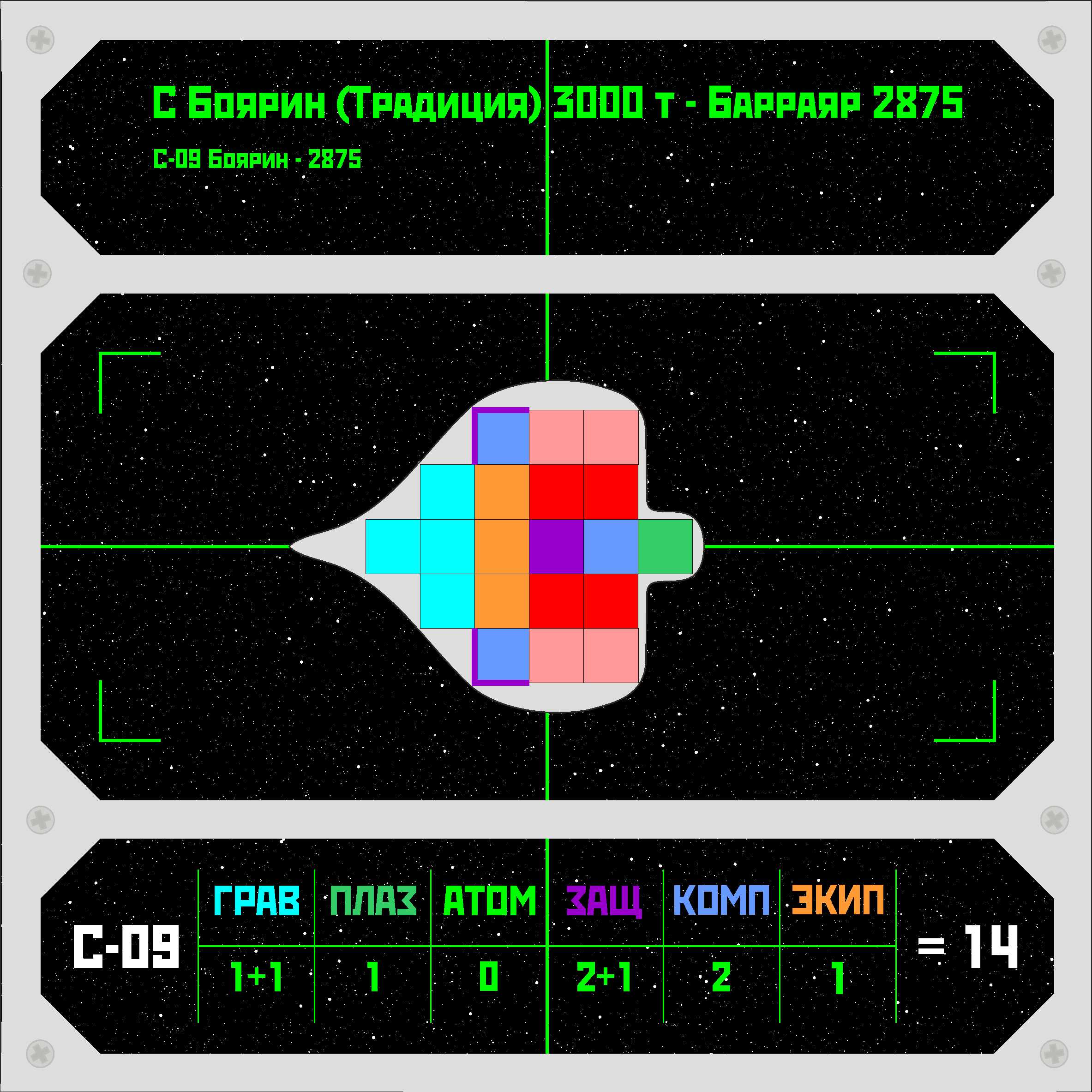 >>680696 ИГ = Искусственная гравитация. Уровень боевой мощи (БМ) для гравиганов (голубой цвет на схеме). ФП = Физика плазмы. Уровень БМ для плазмаганов (ярко-зеленый цвет на схеме). ЯФ = Ядерная физика. На корабле нет Р-зарядов, поэтому в графе стоит нолик. ПС = Пропульсивные системы (двигатели - красный цвет на схеме, топливо - розовый). БзЖ = Борьба за живучесть. Уровень БМ для ионных экранов (фиолетовый цвет на схеме). СиК = Сенсоры и компьютеры. Уровень БМ для бортовых систем (синий цвет на схеме). ТиО = Тактика и организация. Уровень БМ для экипажа (оранжевый цвет на схеме). Желтый на схеме - модуль плазменного зеркала (хуетень, которая делает корабль линкором).