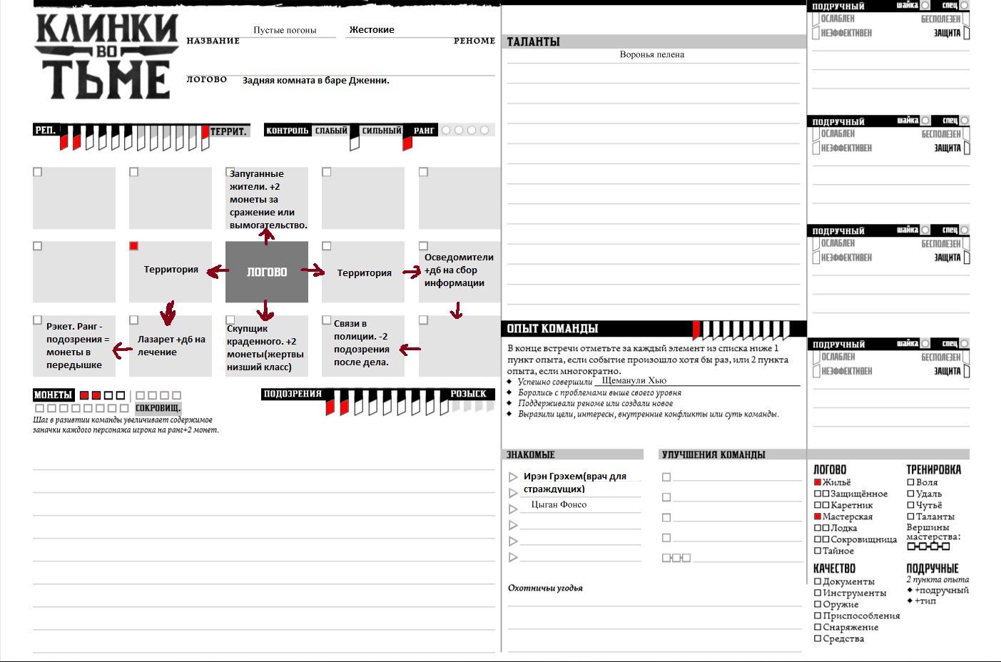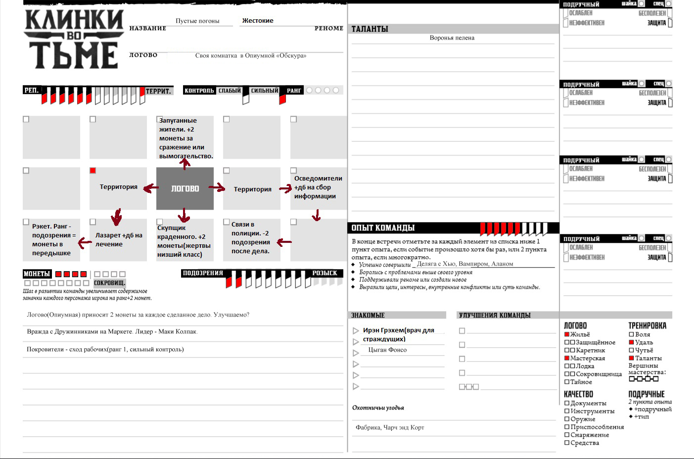 >Короче предлагаю завязки дел на выбор для получения активов. >1)Получить "запуганных жителей". Из болтовни бригадиров с фабрики нитей накаливания компании "Филамент", вы узнаете что по району бродит слепой агитатор призывающий к стачке. Не так чтобы кто-то всерьез слушал его призывы, но тем не менее рабочие не дают бригадирам хорошенько отделать этого бузотера. Он бесит директора фабрики и тот будет благодарен, если кто-то поможет слепому старику свернуть шею. >3)"Скупщик краденного" можно будет заменить на "Представителя или сводника"(смотря какой класс выберете будет +2 за дело с богачами). К Дженни Вильбур обратился знакомый пижон из Маркета, который интересуется людьми способными без шума убрать человека за деньги. Этот человек - мастер с фабрики автоматонов Жан Кельер. Если дело сделать, то Дженни познакомит вас с нанимателем лично и тот сможет давать вам дела из более престижных районов. Еще все конечно забыли, что декан Киль лежит в больничке после встречи с вампиром. Что он дал деньги Полу, чтоб вы помогли ему подставить цыган или убрать их нахуй из города. Ну еще есть скомканная карта из рта Роналдо. И новый четвероногий друг, но скажу честно там пока квест уровня вернуть его за вознаграждение хозяину. Но кто знает, может моя фантазия и роковые дайсы превратят это в долгий лабиринт приключений по погрязшим в пороках улицам. С выживанием в подземных лабиринтах кишащих монстрами и попытками питаться крысиным пометом. >>701367 >а кто у нас на районе наш покровитель, которому мы отстёгиваем? Сход рабочих(ранг - 1) -типа профсоюз и собрание жильцов, нелегальное. Ну а хули вы хотели? Фабричный же район + изначально про геволюцию хотел игру делать. Еще у вас две вражеские организации: это дружинники Маркета и вроде как возчики местные. Но с ними вообще мутно: вы то покупали себе козлов с тележкой, то не покупали... Ну в общем они к вам несколько предвзяты. А вот полиция вообще вас пока считает относительно нормальными жителями района. Так как я вам чето квесты выдаю, сплошь облагораживающие жизнь в городе. Вы так скоро почетными гражданами станете. >>701735 Ну Яков и Ко - тоже вроде ресурса-актива временного. Но ты их не отпускаешь. Ну и может реально хоть крафтить проектом начнешь? А то стыдно: такой серьезный человек, а по чужим кобурам лазит.