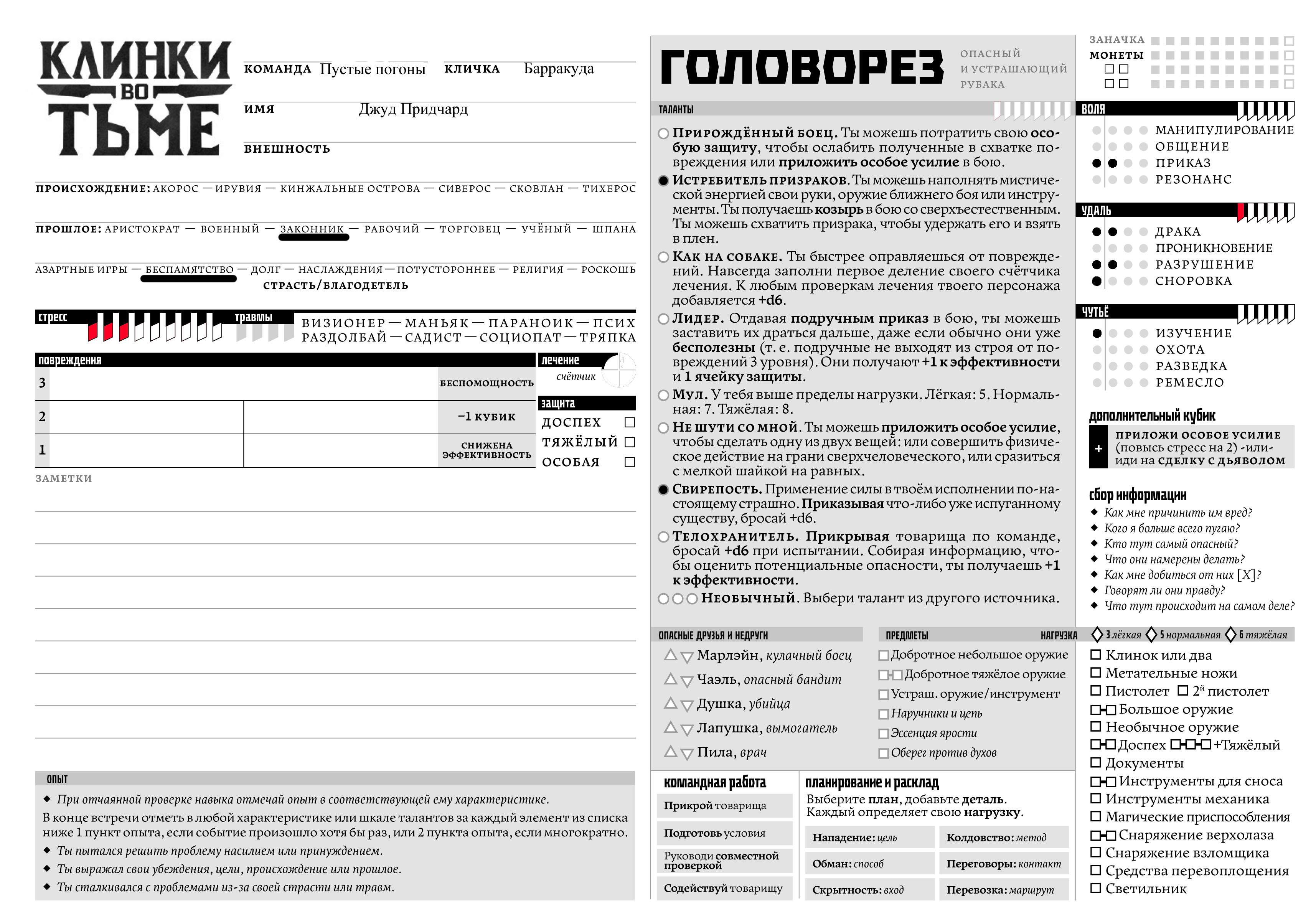 Ладно, не будем ебать вола Действие передышки 1: Снятие стресса - старое доброе бухло. 1d6 стресса снимаю Действие передышки 2: Нанимаем фриков для ловли Алана/охрану нашего актива Ранг и качество 0 Стоимость 1 монета(плачу из кармана) Преимущества: самостоятельный Недостаток: свирепый