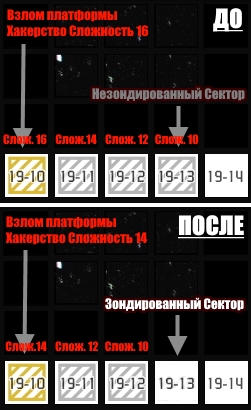 >Можно зондировать только те сектора, которые граничат с белыми секторами. Сложность зондированного сектора, граничащего с белым сектором – (очень легко) 10. >Далее сложность нарастает на + 2 за каждый последующий сектор после граничащего. Куда далее? Если сектор не граничит с белым, то его же нельзя зондировать?