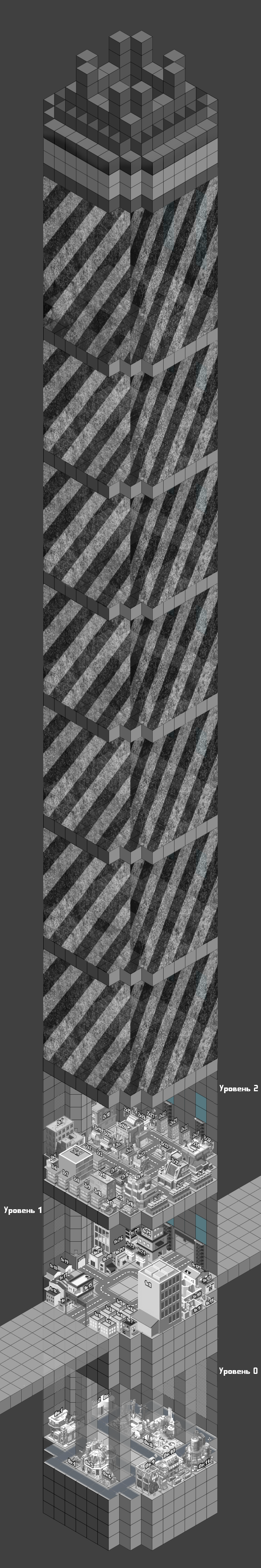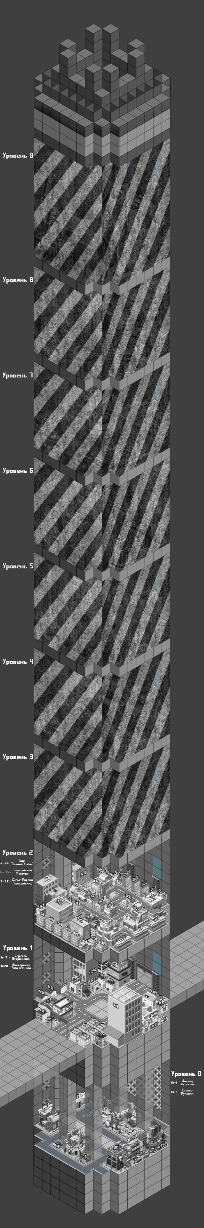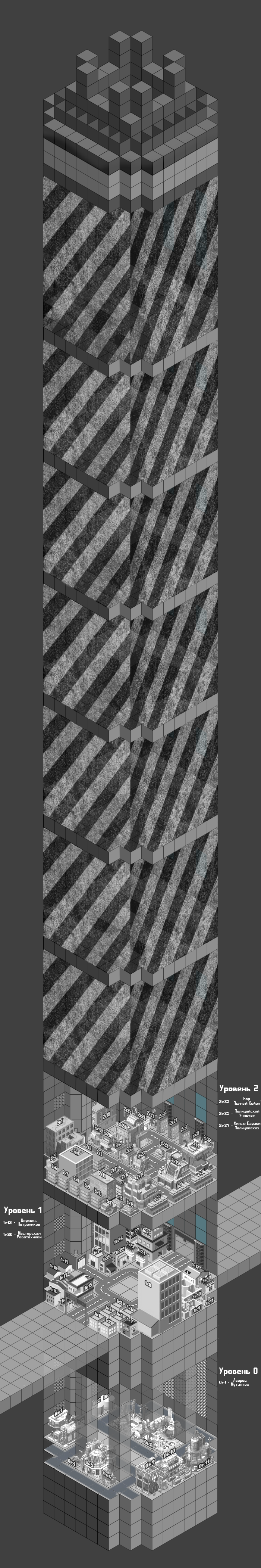 Как карта? С глазами нормально всё? По поводу того, как ей пользоваться и какие объекты выбрать. Выбирайте любые здания и занимайте их согласно вашей характеристики Базирование. Районы пока не будет оформлять подробно, но предлагаю Нетронникам занять первый этаж, мутантам нулевой, а подавителям второй. Для мутантов на нулевом этаже есть канализация, поставил там что-то вроде оранжереи на 0к5. На первом для нетронников есть руины, за церковь можно взять здание 1к12, например. На втором уровне воссоздал такой киберпанковский райончик в стиле Бронкса для полицейских. И да, город получился гораздо крупнее, чем то было описано в первом посте. Каждый куб на карте имеет размеры 10х10х10 метров