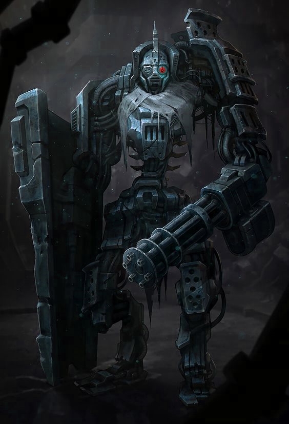 Несколько шагов по направлению к неотроникам произвела огромная стальная махина – трёхметровый боевой робот вооружённый гигантским многоствольным пулемётом и толстым непробиваемым щитом с виду походившим на бронированный кузов крупного транспорта. Гигантский страж, охраняющий проход, сохраняющий его статус неприступности. Сектор неразведан.