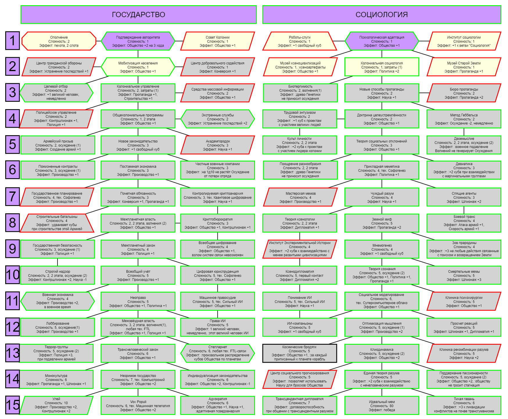 >>703048 Все верно, но плюс к этому какого бы цвета ни была технология (прямоугольник), ее можно всегда изучить наукой. >Все технологии могут быть исследованы с помощью Науки. Но некоторые можно открыть, частично или полностью используя другие параметры. В частности: >в синей рамке — открывается только с помощью Науки, >в зелёной или белой — можно дополнительно использовать Общество, >в красной — Производство, >в чёрной — открывается любым параметром.