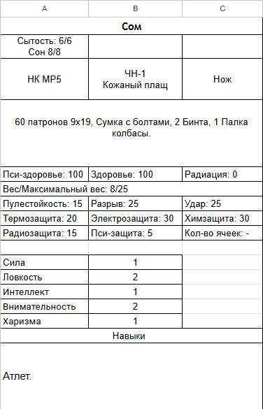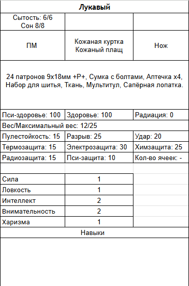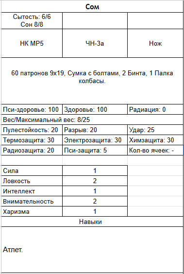 Раз уж несколько игроков, попробую поводить для нескольких игроков на замкнутой локации. Если кто-то играл в/слышал о моде "Пространственная Аномалия", то завязка будет +- такая же, за исключением того, что НПС соломку не постелят и вы там будете, условно первыми. Глобальная цель для персонажей, выбраться из этой напасти и выжить. Думаю над тем, чтоб со старта дать на выбор несколько навыков, чтоб игроки могли подкрепить свою предысторию. Придумаю новые или дам старые, поглядим. В день можно будет сделать 4 дела, на которые тратится 1 ед. Сытости и Сна. Пока в голове это исследование соседних точек интереса, сделать что-то полезное в условном хабе. Сытость и Сон поменял местами, теперь Сытость 8/8, Сон 6/6. Кмк это логичнее чем было у ОПа. Ну и остальное по мелочи, что уже игрокам знать не надо.