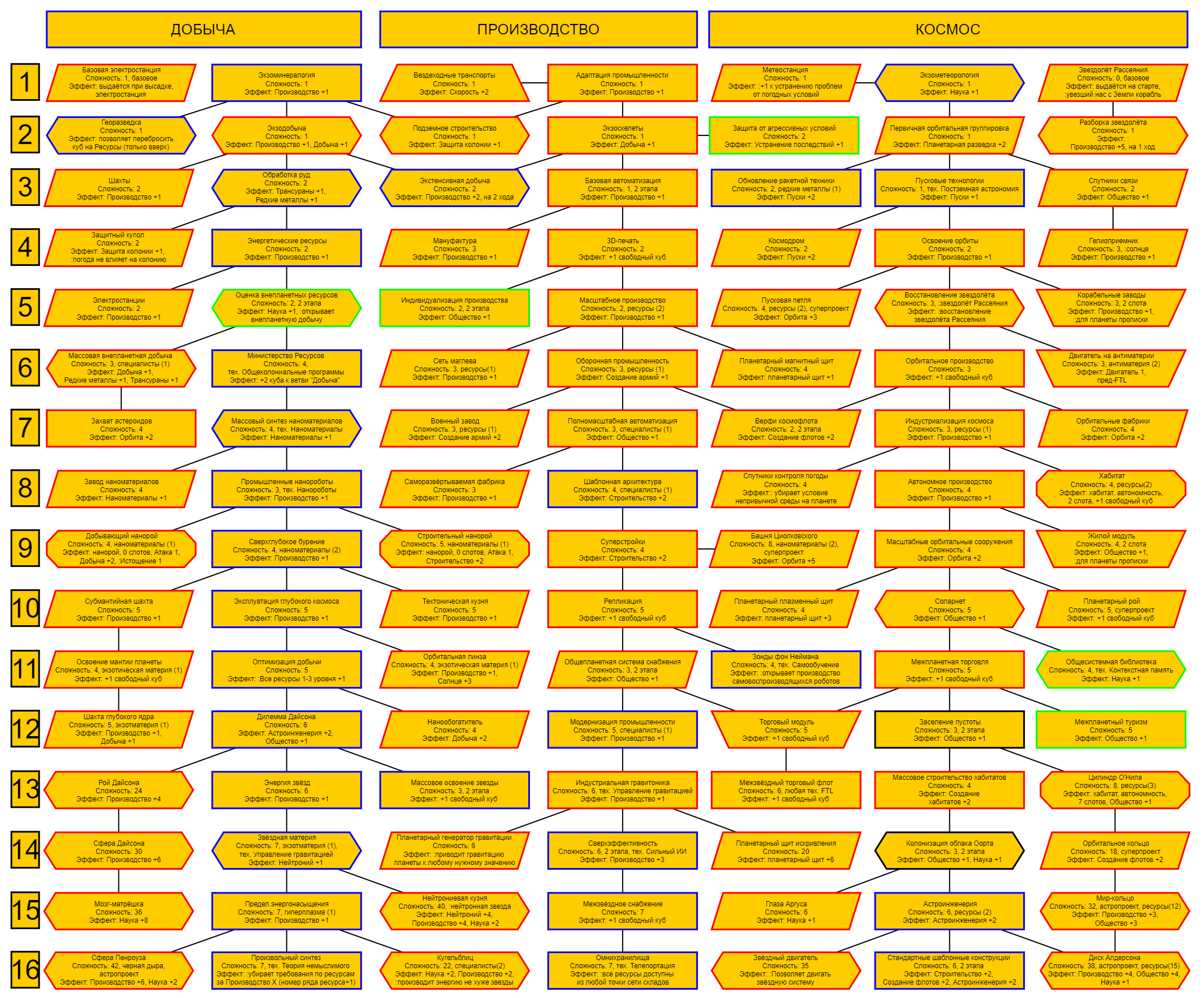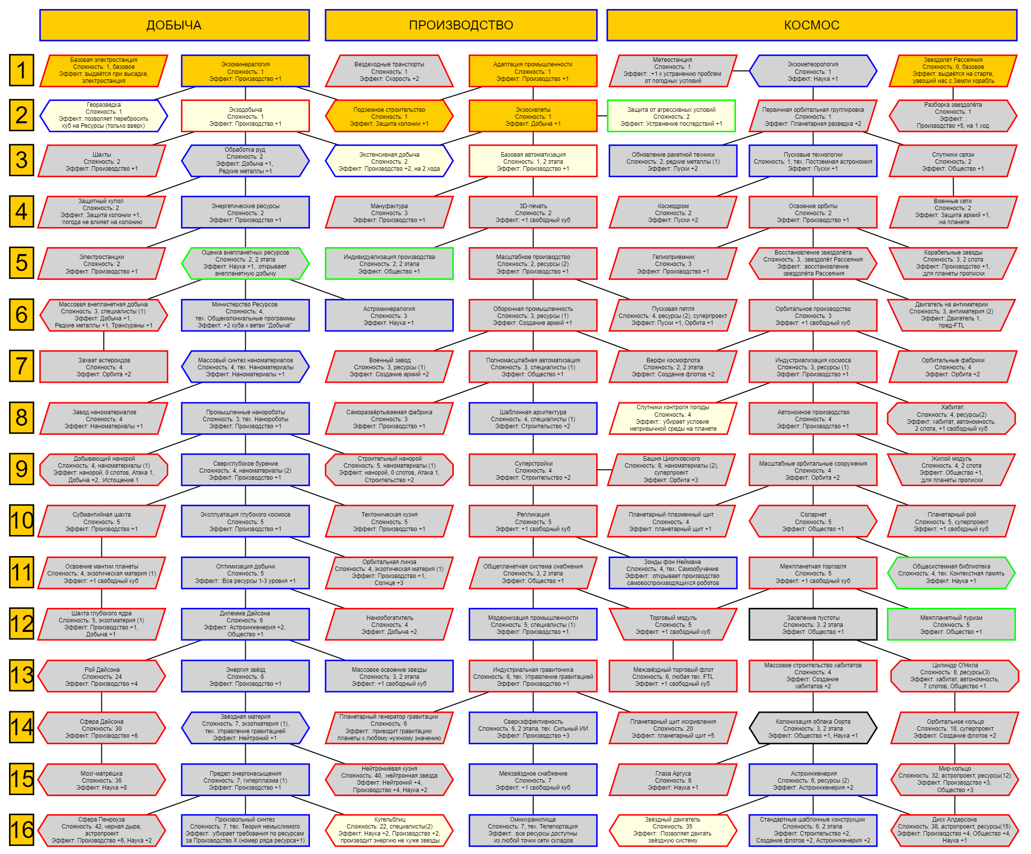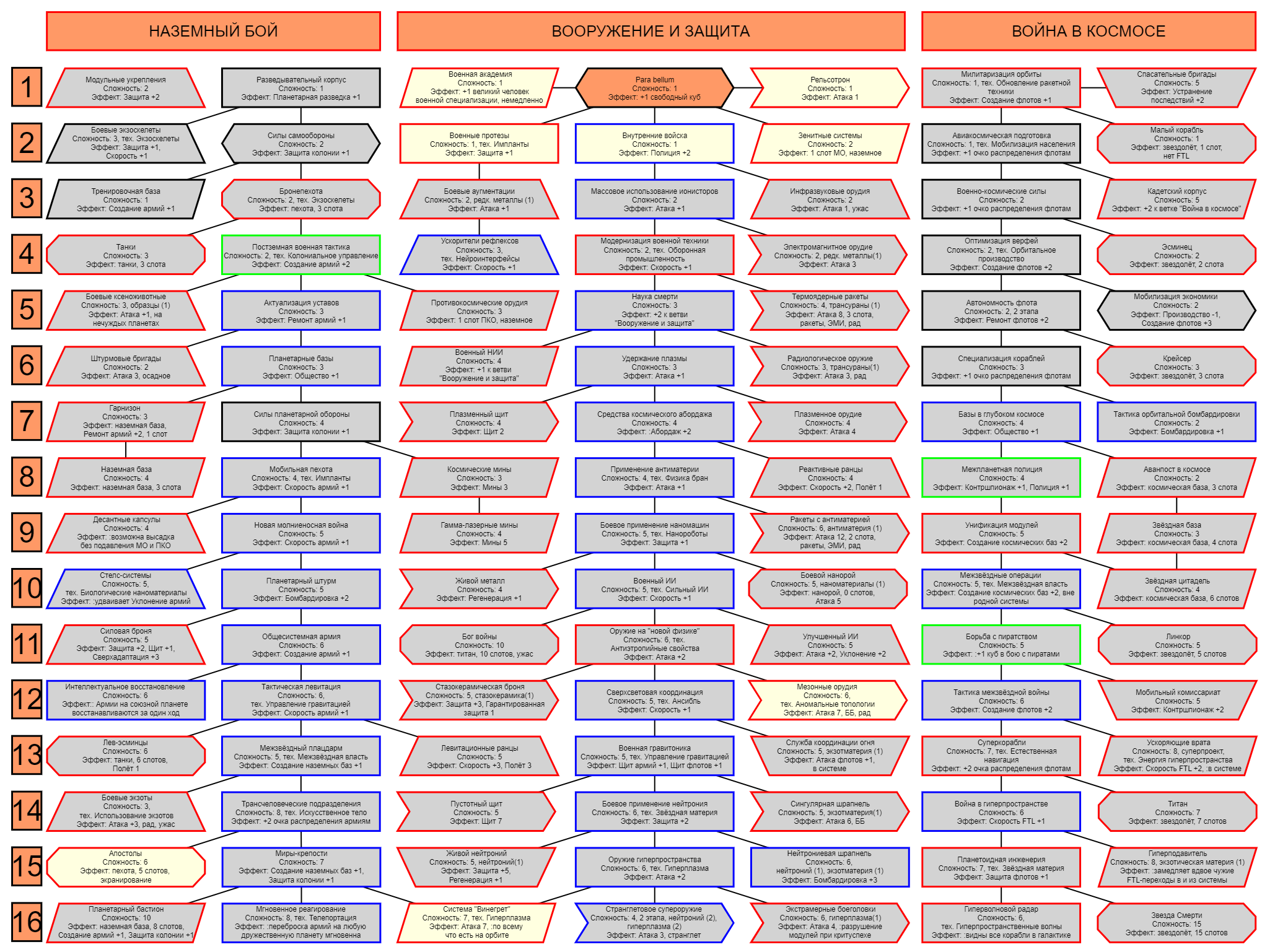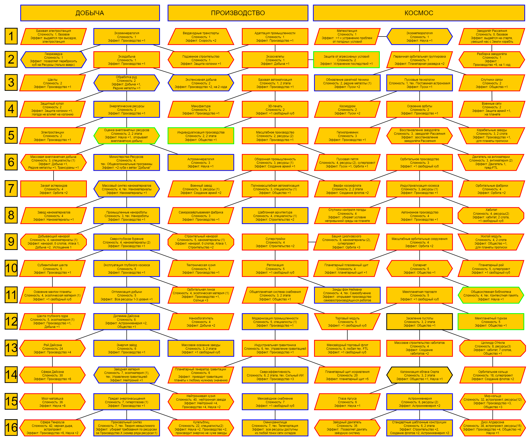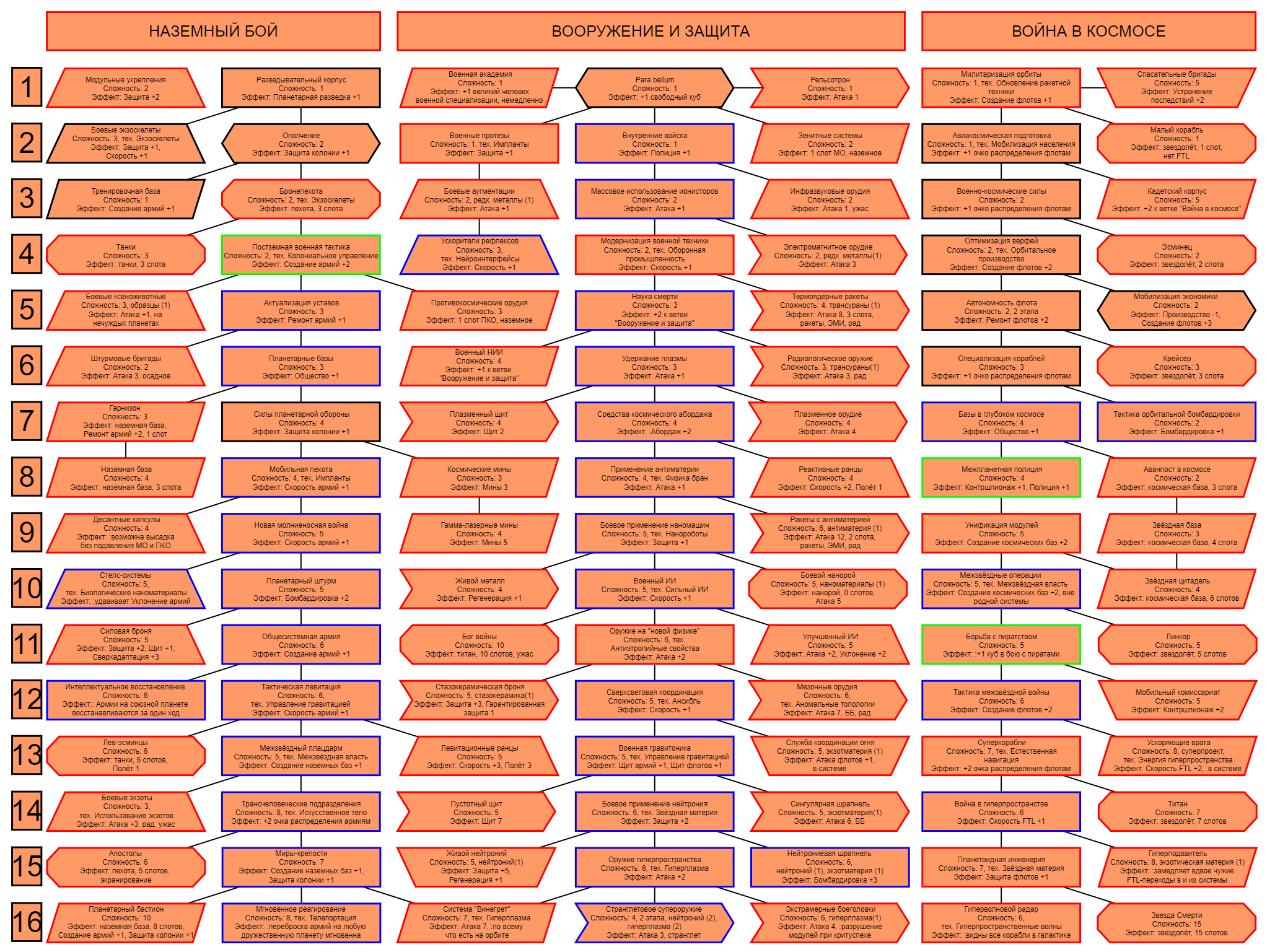 >>704081 > для каждой экосистемы отдельная технология/проект? Игромеханически не предусмотрено, так что один на всë > Строительство кораблей без "Милитаризации орбиты" невозможно? Например каких-нибудь гражданских корыт для разведки, грузоперевозки и добычи? Ниже все правильно сказали, игромеханически - нет. Так в теории корабли начинают строиться сами где-то после Освоения орбиты, но этот никак нигде не отражается. А тебе зачем собственно? > Почему восемь? Вроде ж 4 должно быть Потому что из-за моего косяка в правилах было написано что люди дают свой бонус к любому количеству проектов, а не один раз, как остальные кубы. Вот поэтому.