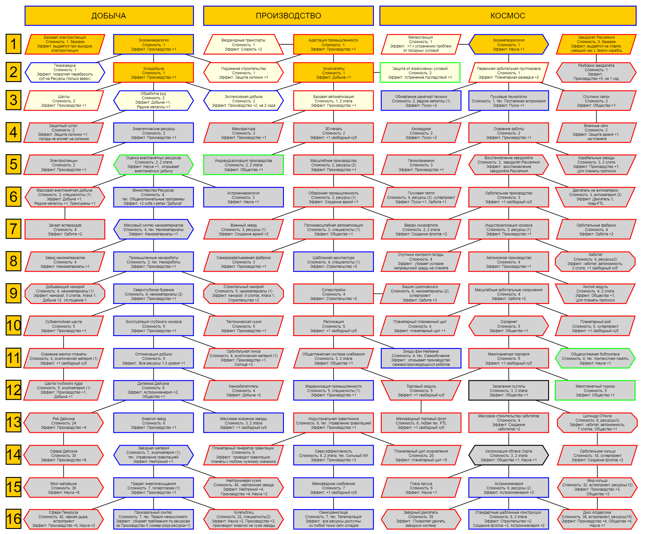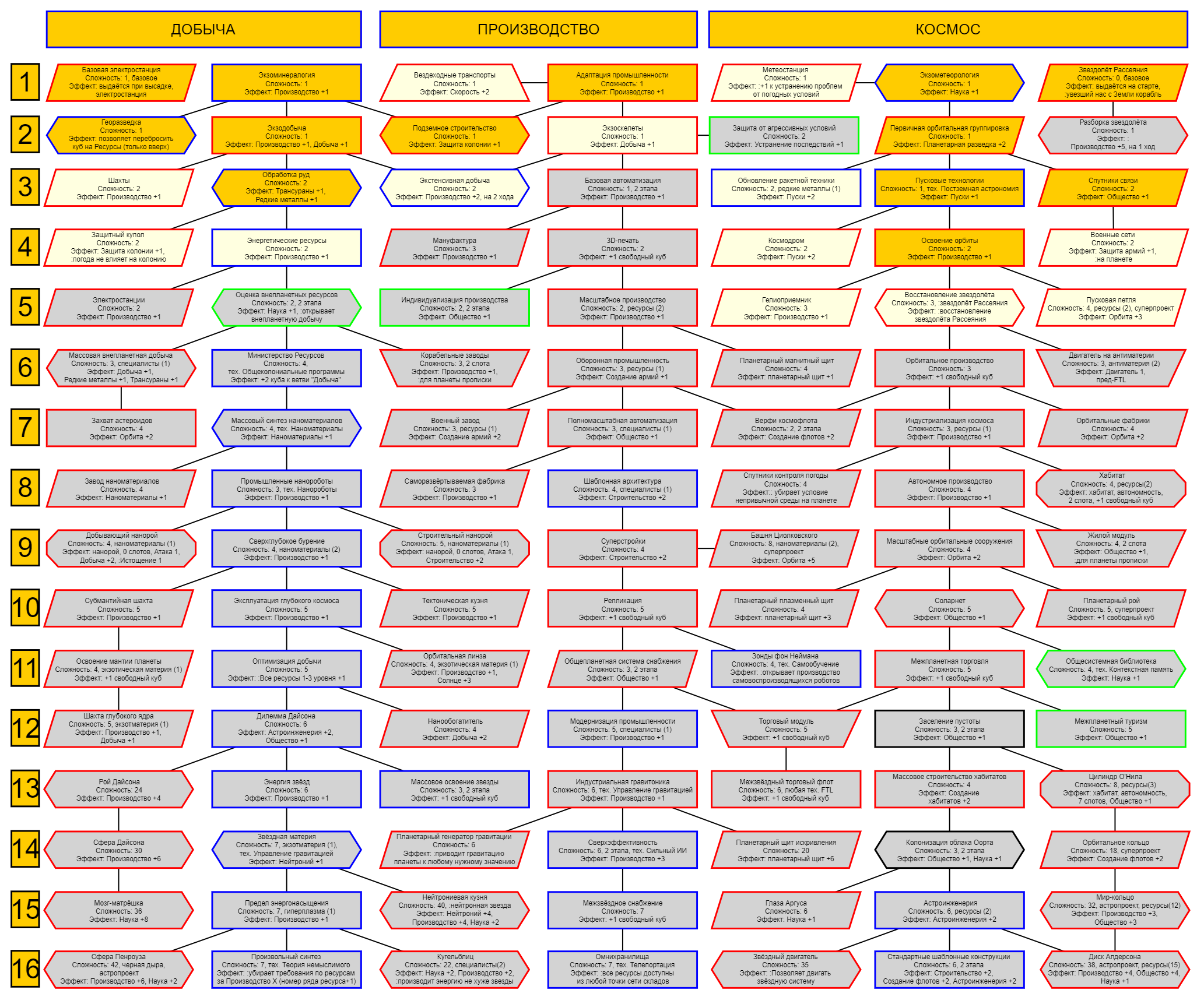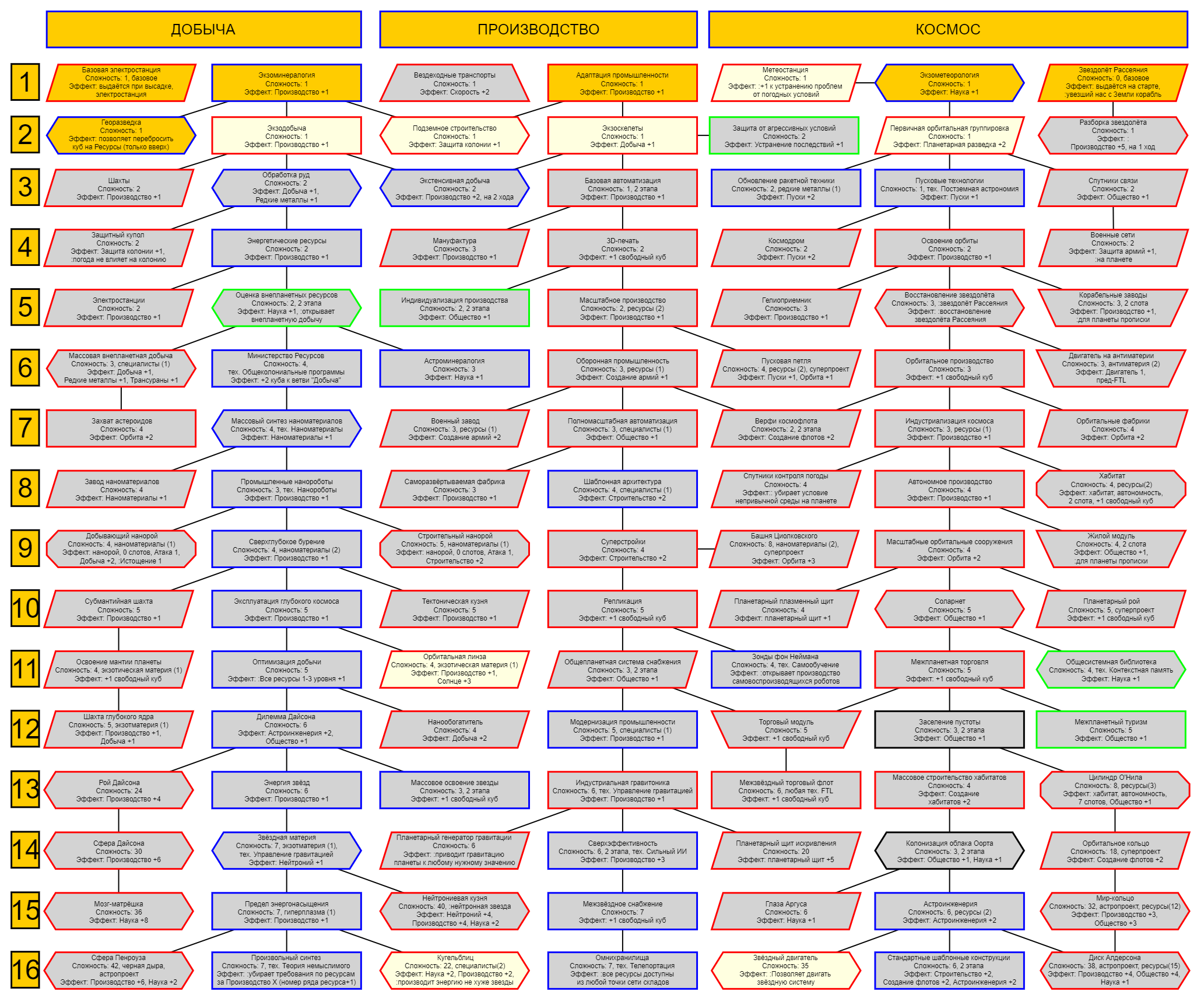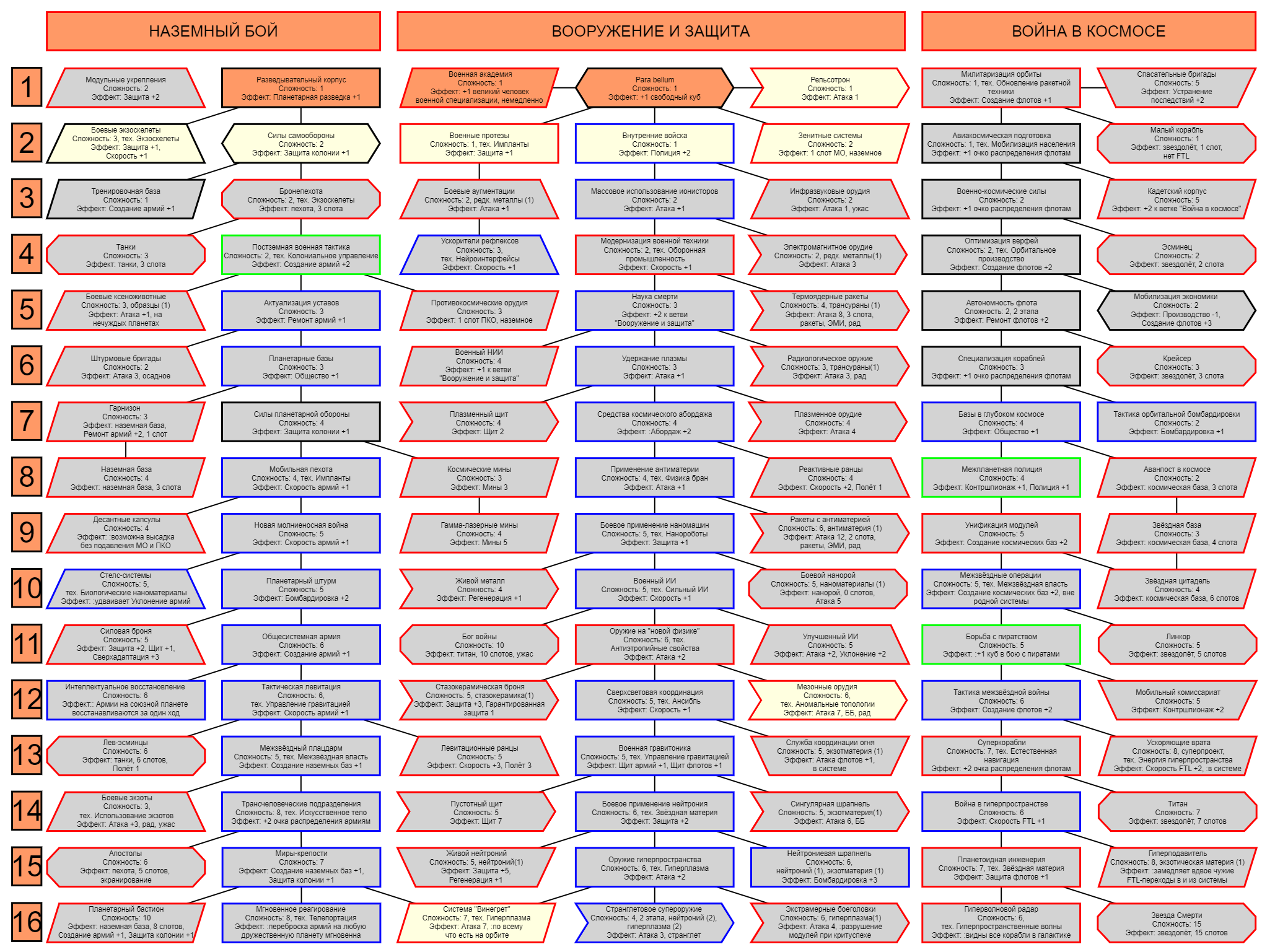 >>704081 > для каждой экосистемы отдельная технология/проект? Игромеханически не предусмотрено, так что один на всë > Строительство кораблей без "Милитаризации орбиты" невозможно? Например каких-нибудь гражданских корыт для разведки, грузоперевозки и добычи? Ниже все правильно сказали, игромеханически - нет. Так в теории корабли начинают строиться сами где-то после Освоения орбиты, но этот никак нигде не отражается. А тебе зачем собственно? > Почему восемь? Вроде ж 4 должно быть Потому что из-за моего косяка в правилах было написано что люди дают свой бонус к любому количеству проектов, а не один раз, как остальные кубы. Вот поэтому.