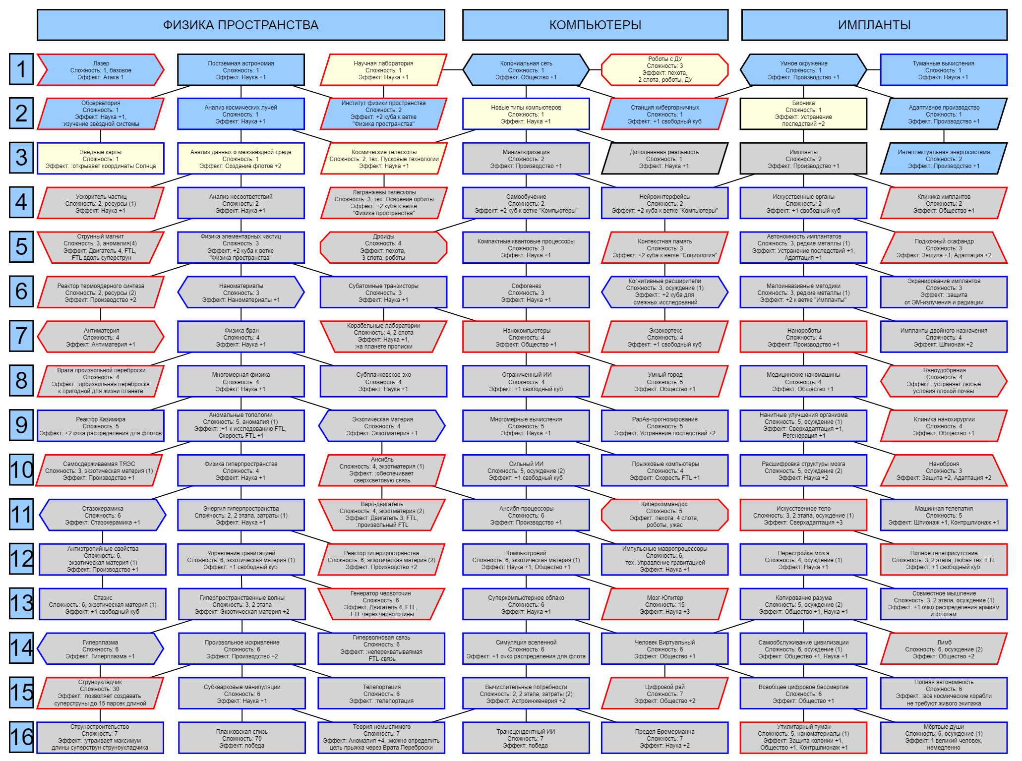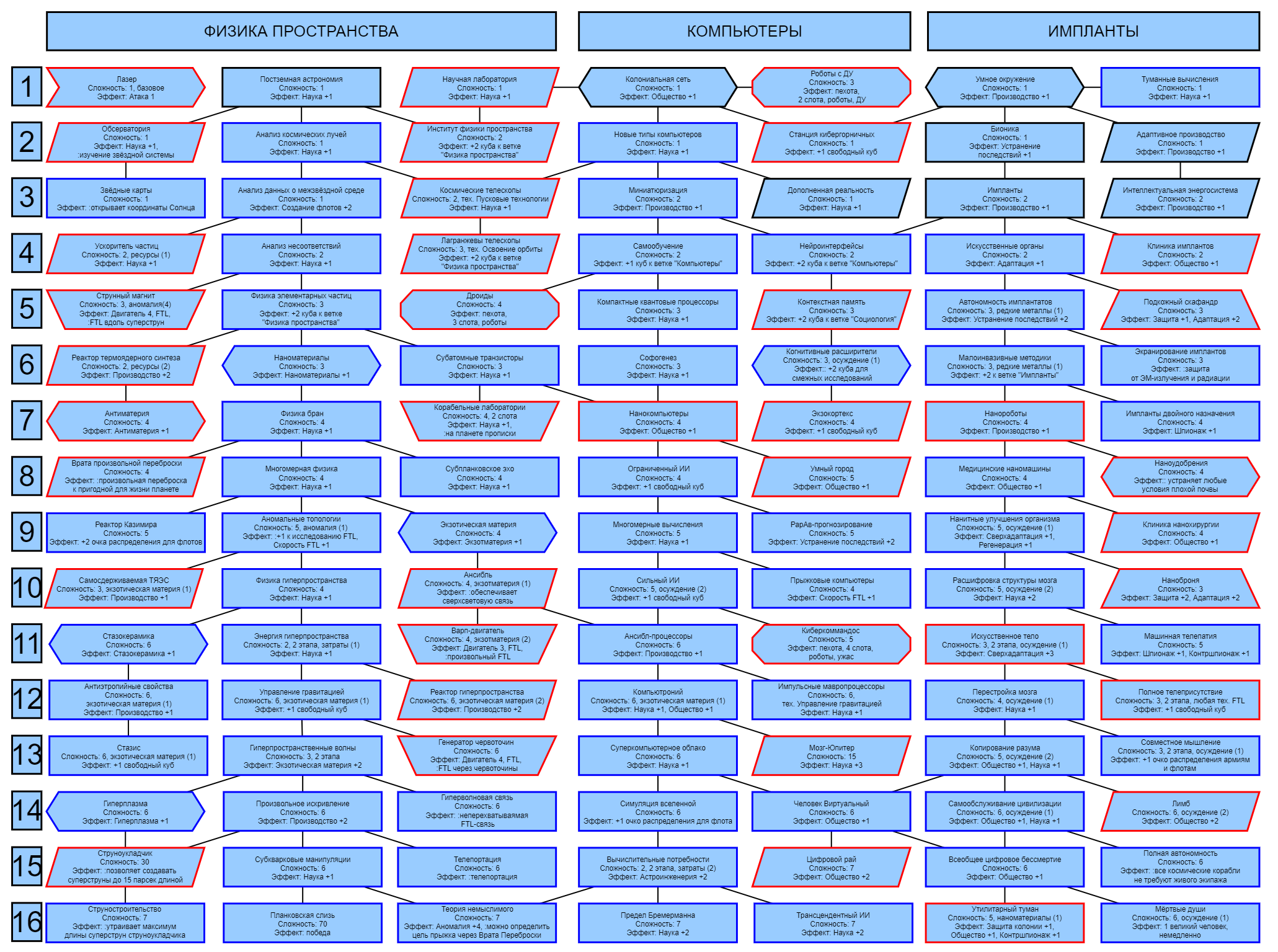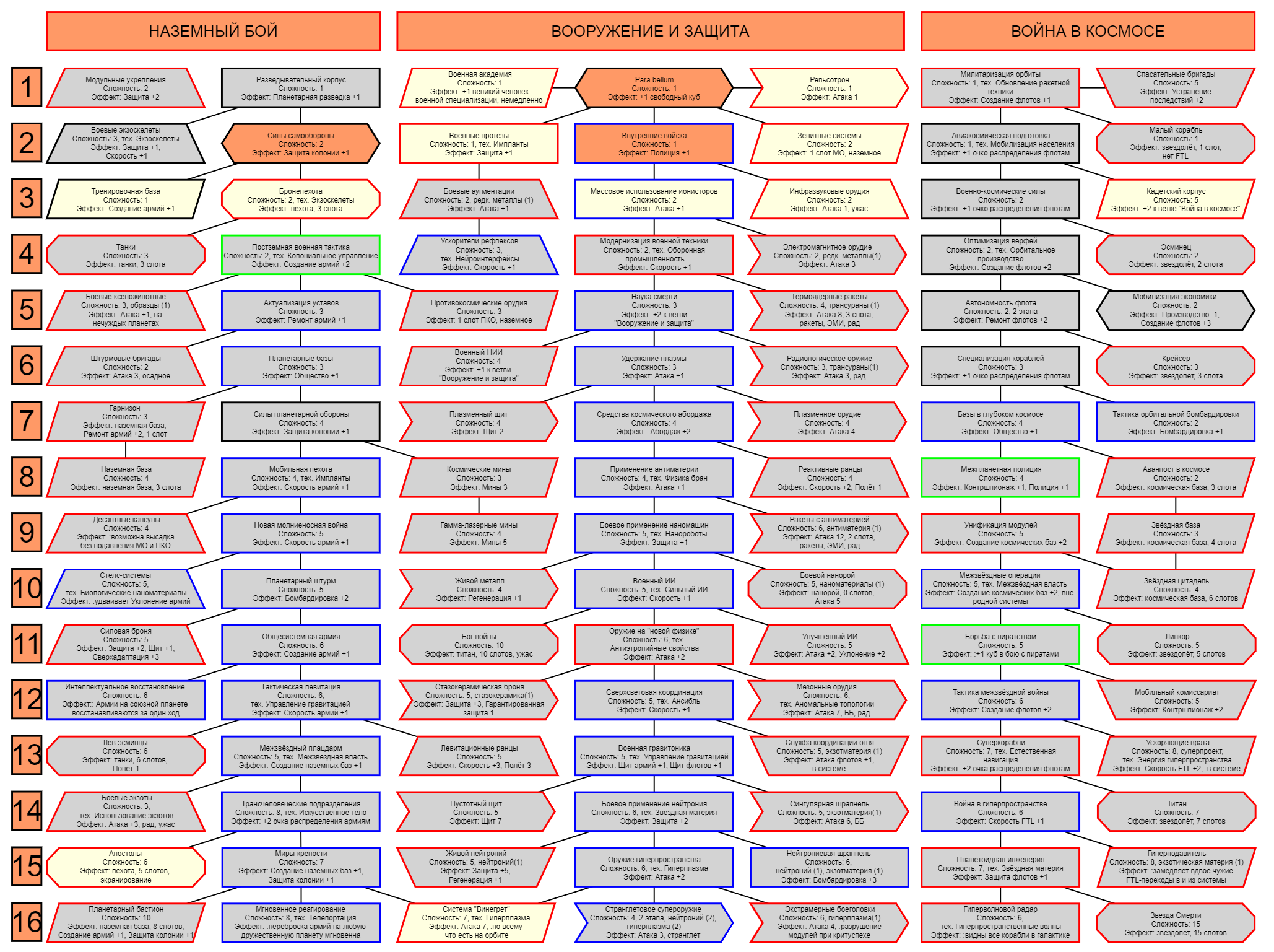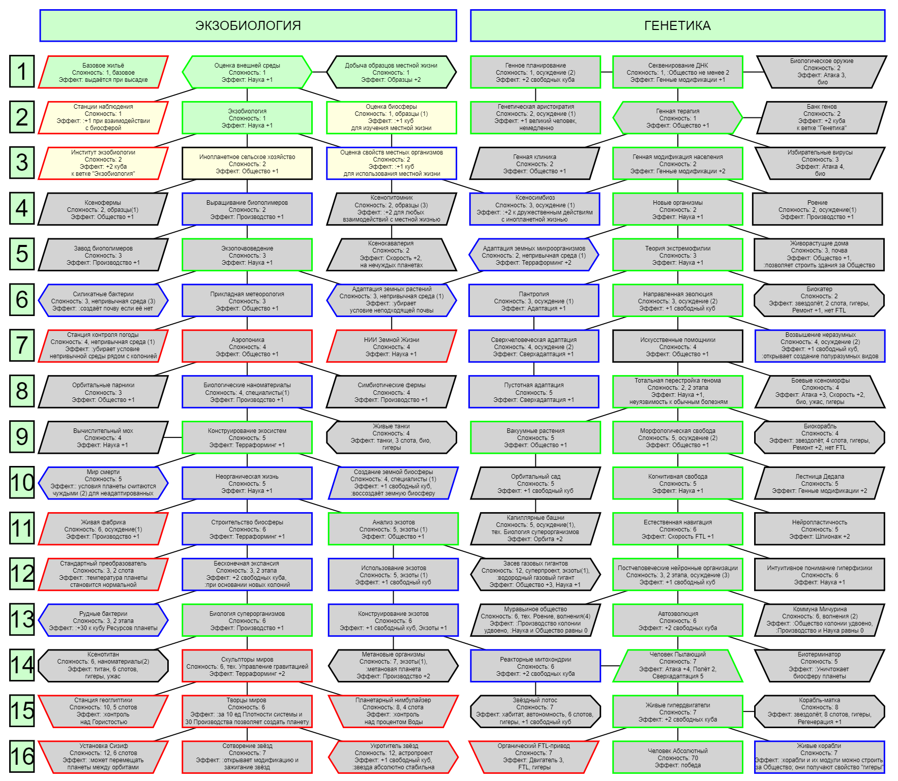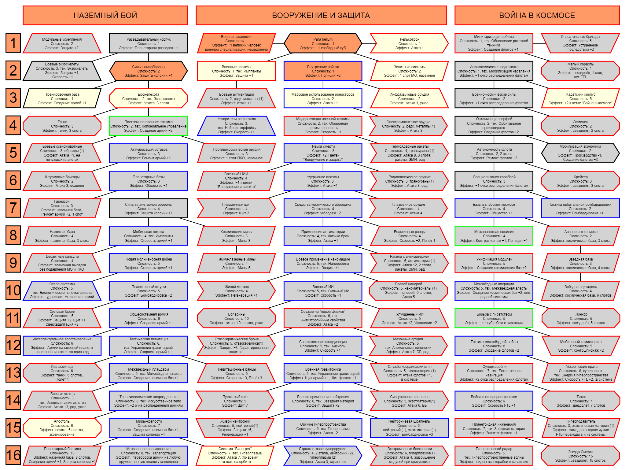 >>704081 > для каждой экосистемы отдельная технология/проект? Игромеханически не предусмотрено, так что один на всë > Строительство кораблей без "Милитаризации орбиты" невозможно? Например каких-нибудь гражданских корыт для разведки, грузоперевозки и добычи? Ниже все правильно сказали, игромеханически - нет. Так в теории корабли начинают строиться сами где-то после Освоения орбиты, но этот никак нигде не отражается. А тебе зачем собственно? > Почему восемь? Вроде ж 4 должно быть Потому что из-за моего косяка в правилах было написано что люди дают свой бонус к любому количеству проектов, а не один раз, как остальные кубы. Вот поэтому.