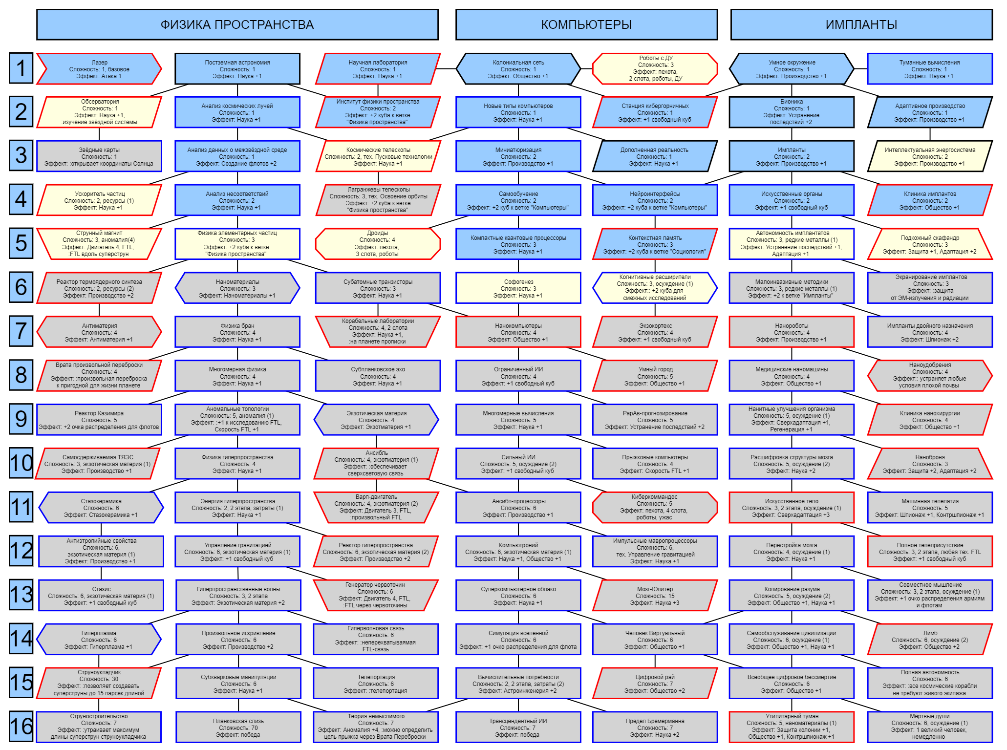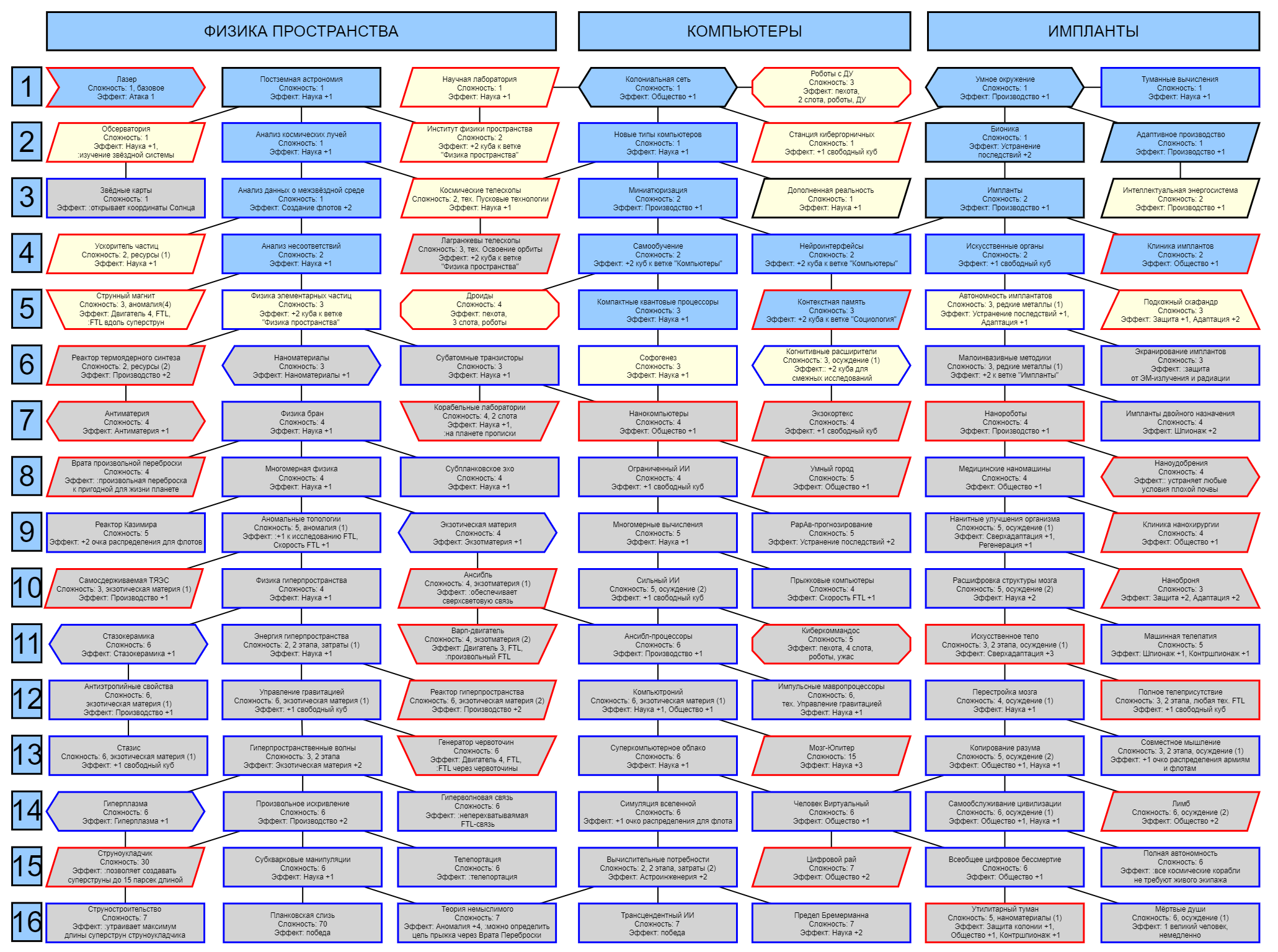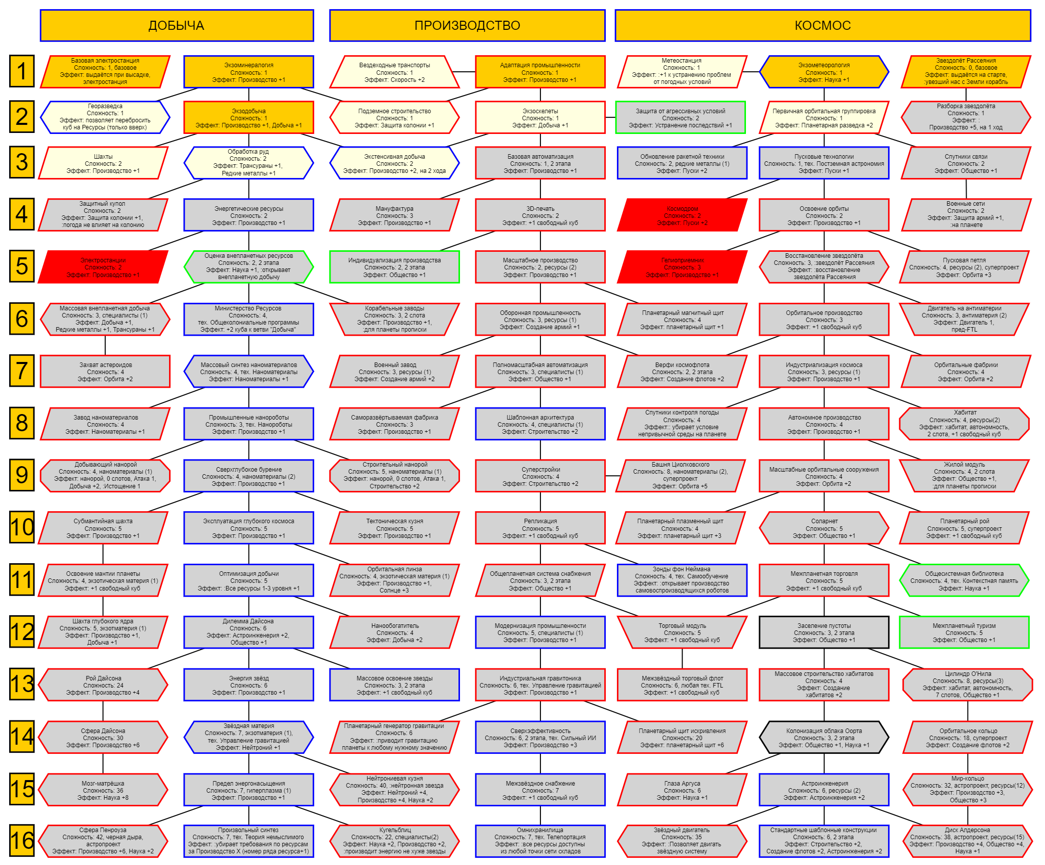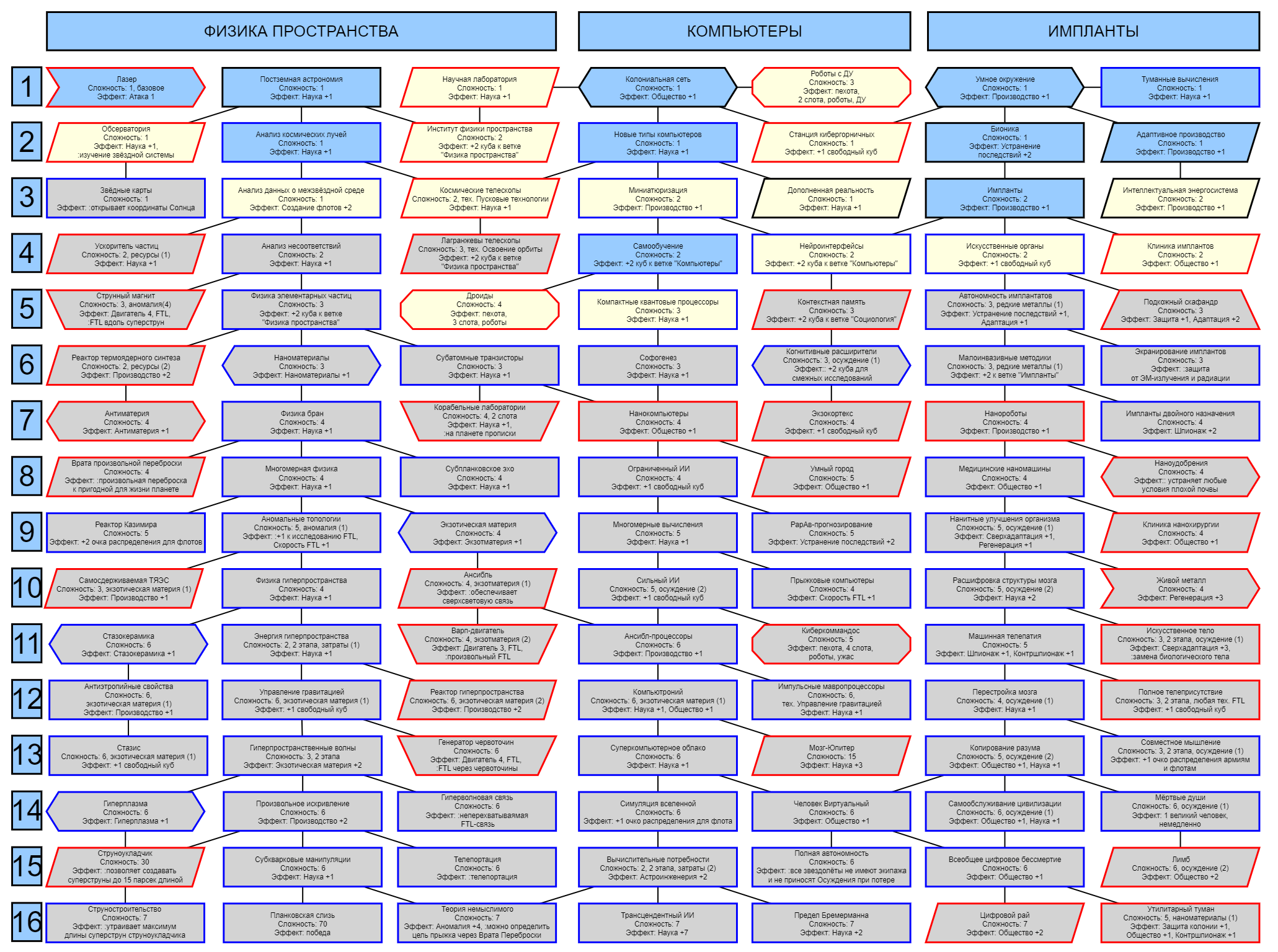 >>704081 > для каждой экосистемы отдельная технология/проект? Игромеханически не предусмотрено, так что один на всë > Строительство кораблей без "Милитаризации орбиты" невозможно? Например каких-нибудь гражданских корыт для разведки, грузоперевозки и добычи? Ниже все правильно сказали, игромеханически - нет. Так в теории корабли начинают строиться сами где-то после Освоения орбиты, но этот никак нигде не отражается. А тебе зачем собственно? > Почему восемь? Вроде ж 4 должно быть Потому что из-за моего косяка в правилах было написано что люди дают свой бонус к любому количеству проектов, а не один раз, как остальные кубы. Вот поэтому.