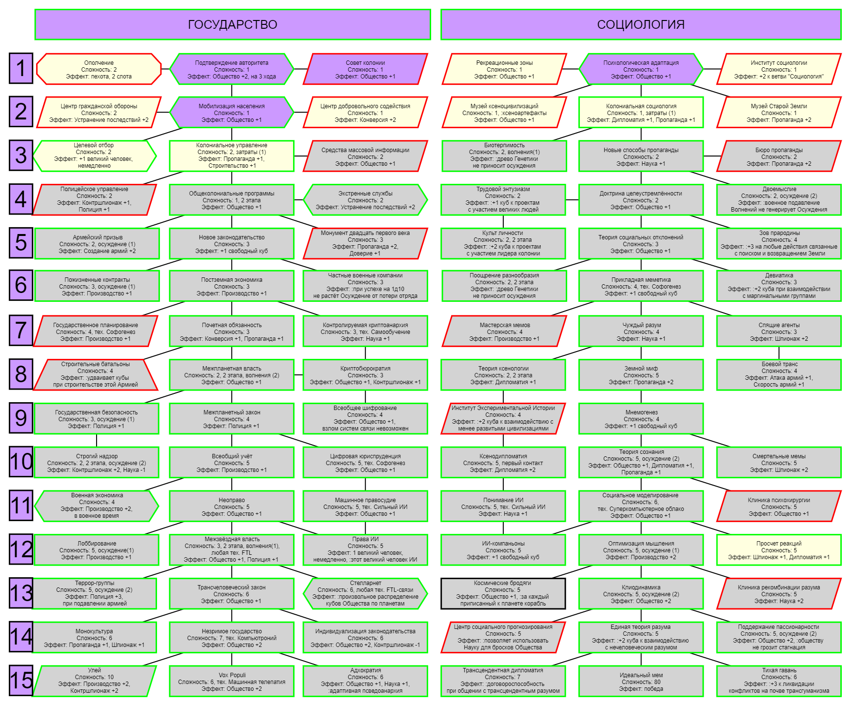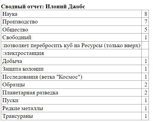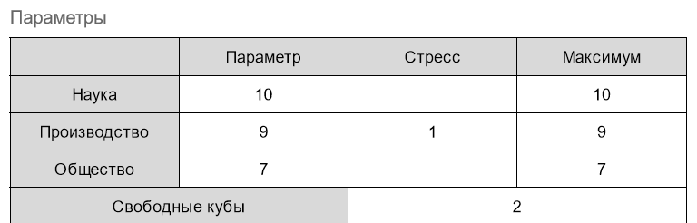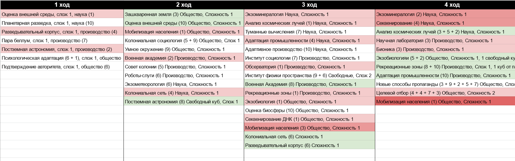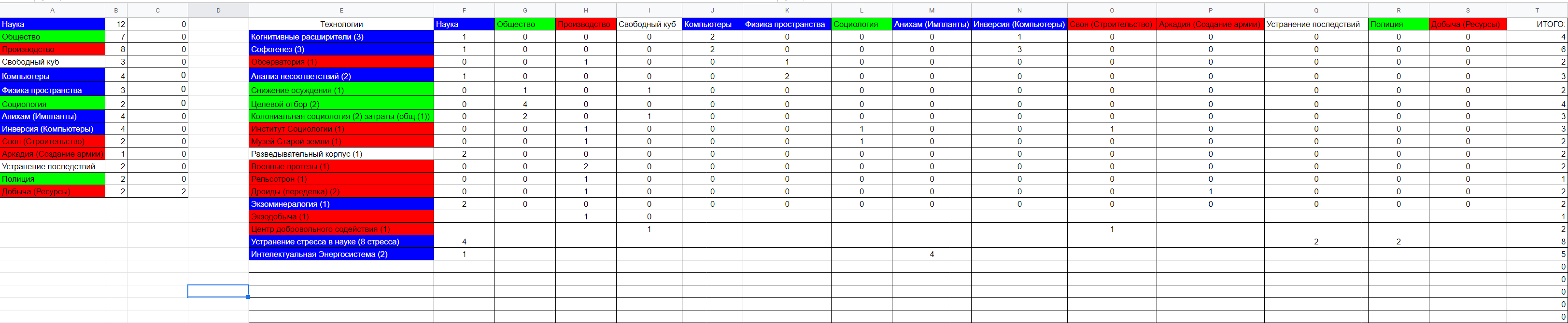 Получается у меня остались два лишних куба Общества. Я бы докинул их в мобилизацию населения, но это же почти как переигрывать, а тут так не принято. Предлагаю следующее решение проблемы: Эти два лишних куба общества я подсовываю вместо двух кубов Науки в Секвенировании ДНК, а два куба Науки я вложу в Анализ данных о межзвездной среде. М?