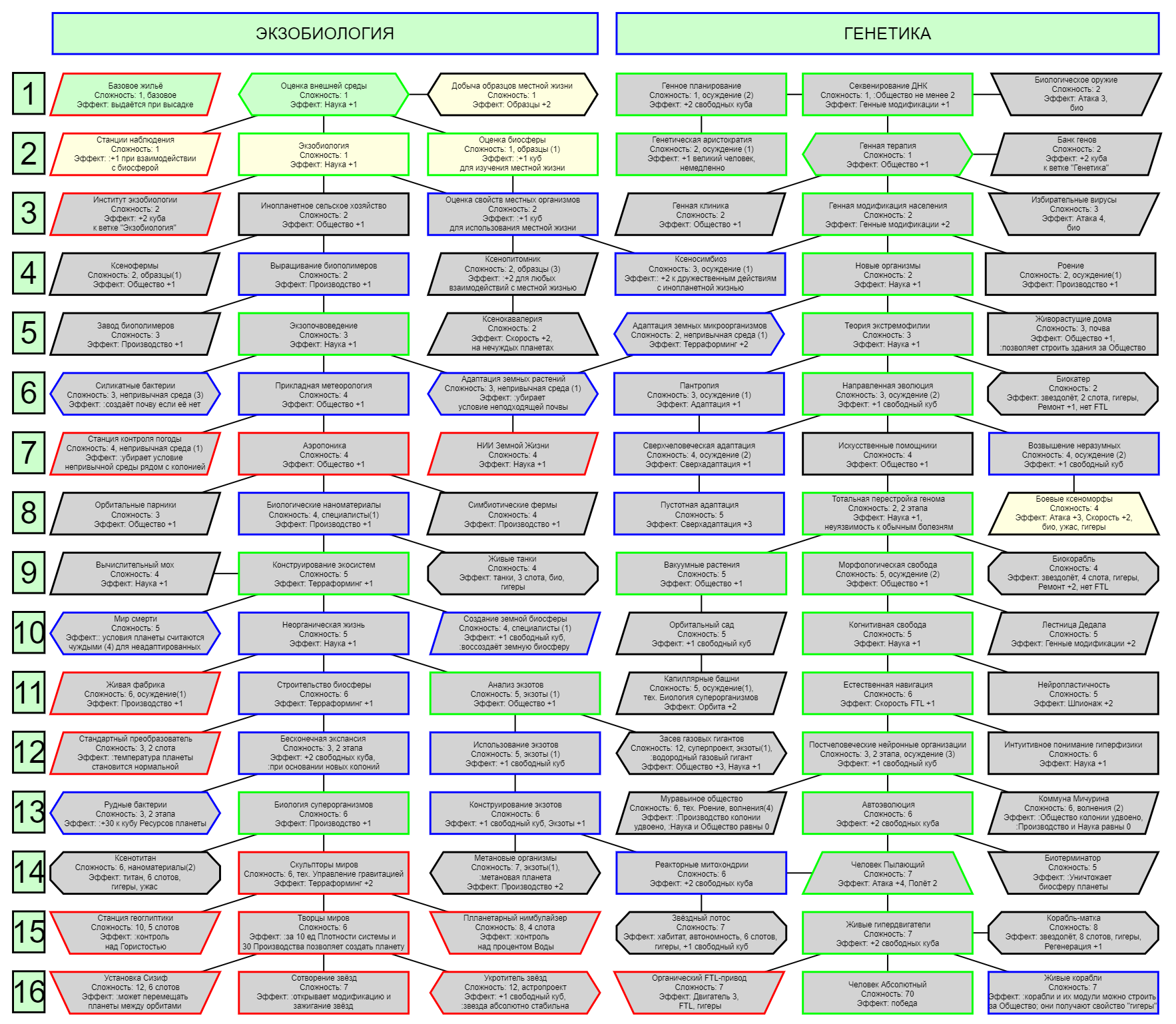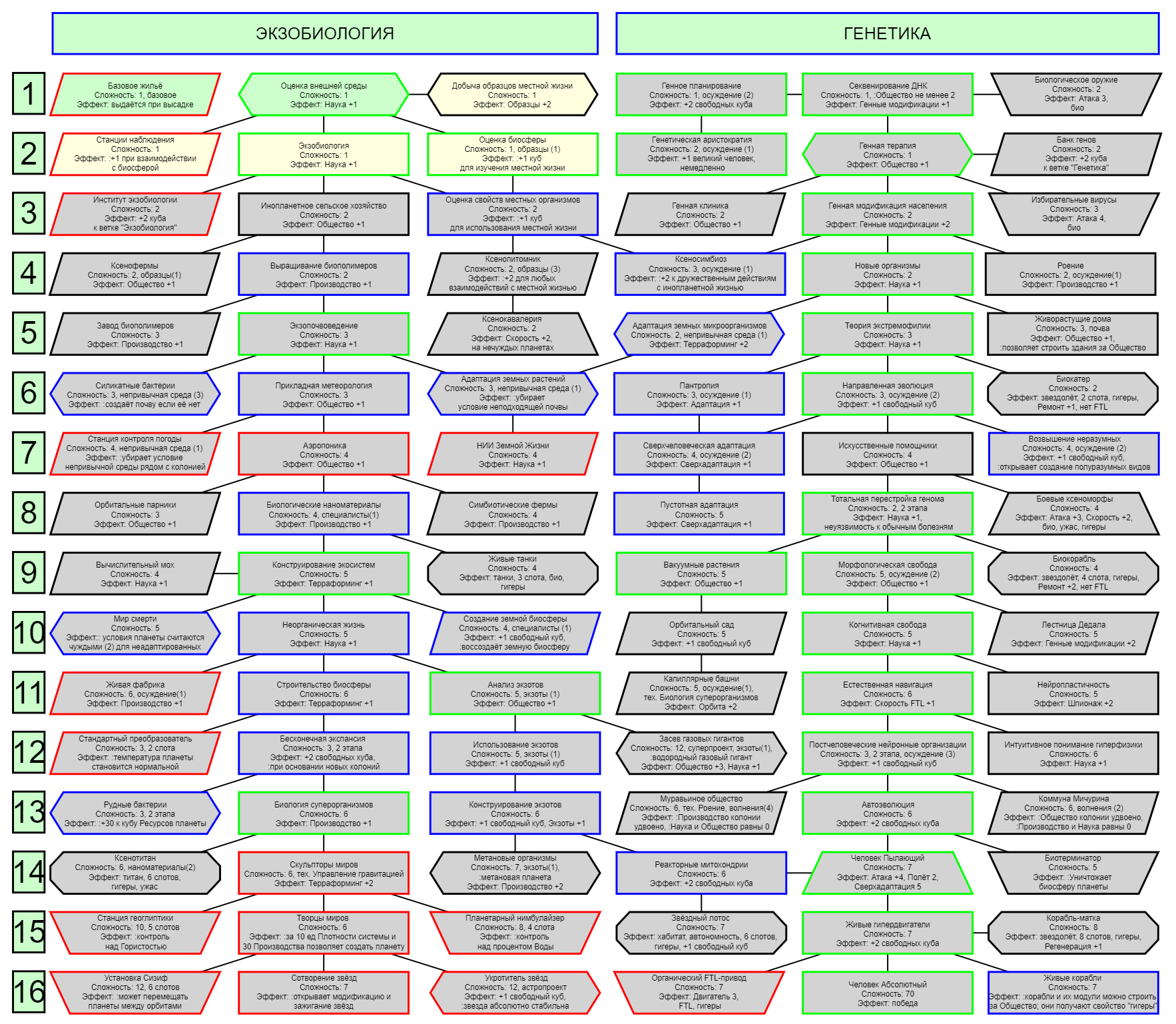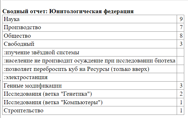 Вопросы: Мне так и не ответили: для добычы образцов и оценки биосферы в моем случае можно делать 1 раз на все или для каждой экосистемы отдельная технология/проект? Строительство кораблей без "Милитаризации орбиты" невозможно? Например каких-нибудь гражданских корыт для разведки, грузоперевозки и добычи? >А, не, не всё, лидеры на этот ход уровень+3 дают. Так что у тебя там не один куб от лидера, а ВОСЕМЬ. Хы-хы. Почему восемь? Вроде ж 4 должно быть.