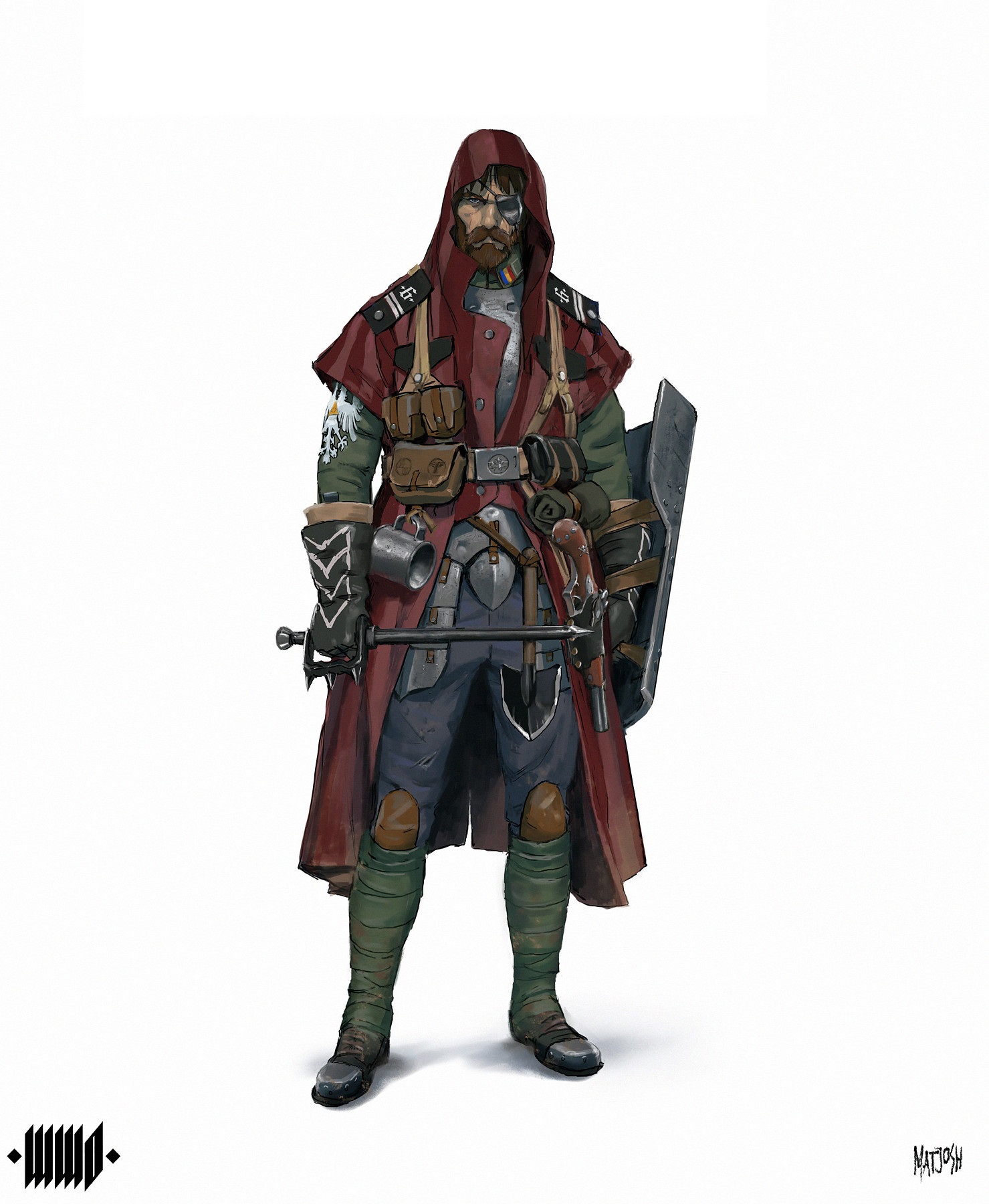 Через пару минут из-за двери послышались шаги и шарканье. Перед Бернардом появился невысокий, хмурый, но крепко сбитый мужчина в кирасе. Он все еще носил армейскую униформу королевства к югу от Лодезии, чье название Бернард не помнил, и выглядел куда приличнее своих подчиненных. Левый глаз и часть лица вокруг него были закрыты дубленым куском черной кожи. На поясе у него висел набор не то оружия, не то инструментов. Он кивнул Бернарду и приоткрыл дверь, после чего провел парня по тихим, прокуренным коридорам штаба - вниз, который служил если не тюрьмой, то местом временного задержания.