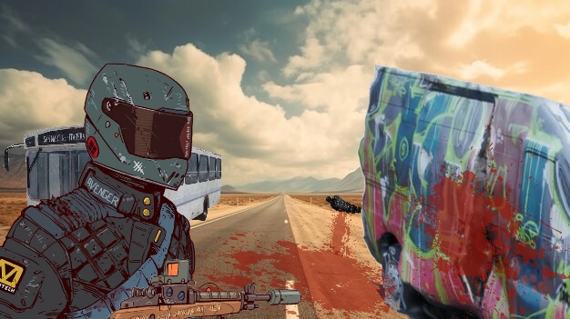 >Старый кибер-вояка появился на автобусной остановке, словно бы ожидая рейса. Фургона нигде не было, зато в метрах в 10 от остановки стоял новенький автобус, сверкающий ключами в замке зажигания. Сухпай обнаружился тут же, на одном из сидений. Вырулив на дорогу и мучаясь от адской жары, кибер-воин покатил по дороге..