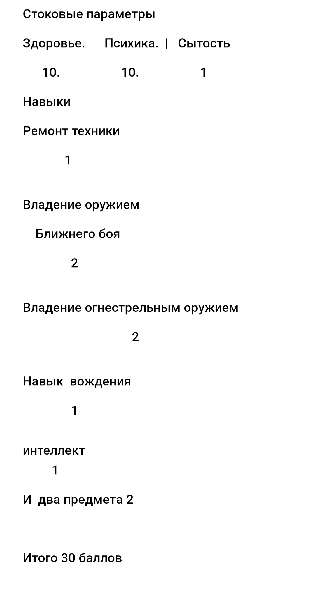 При стандартных параметрах погодных условий: Пройденный путь — напрямую зависит от навыка вождения: (0=150км) (1=200) (2=400) (3=600) (4=800) (5=1000) (можно проехать и меньше, укажите это в посте) ------------------------------------------------------ Потребление воды — в день персонажем поглощается 3 литра воды + радиатор фургона требует 5 литров на каждые 100 километров пути. К тому же персонажу необходимо мыться минимум раз в неделю, иначе он получит эффект Испачканности. ------------------------------------------------------ Потребление пищи — в день персонажу необходимо 1000 калорий для выживания. Калорийность пищи берется Опом из Интернета. ------------------------------------------------------ Потребление топлива — фургон требует 20 литров топлива на 100 километров пути. Тут все просто: остерегайтесь движковых паразитов!