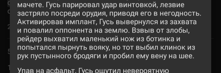 >>710213 >>710211 >>710210 Открыв незапертые двери кузова, Гусь принялся осматривать припасы. Внутри не было оружия, зато Гусю удалось вынести пару баков с водой и штук десять пайков. Занятый перегрузкой добычи, он не заметил, как из дорожной пыли поднялись двое местных жителей. Рейдеры уже приготовить вонзить лезвия в спину путника, когда Гусь, резко обернувшись, выхватил винтовку и выстрелил в ближайшего грабителя. Второй, исполнив кувырок, быстро сократил дистанцию и ударил своим мачете. Гусь парировал удар винтовкой, лезвие застряло посреди орудия, приводя его в негодность. Активировав имплант, Гусь вывернулся из захвата и повалил оппонента на землю. Взвыв от злобы, рейдер выхватил маленький нож из ботинка и попытался пырнуть вояку, но тот выбил клинок из рук пустынного бродяги и пробил ему вену на шее.