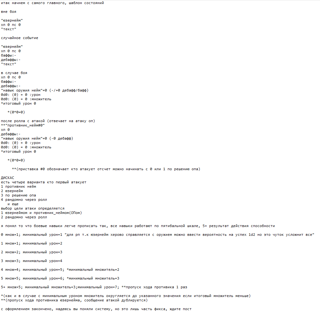 Как вам идея выкатить "LTRS арену" отдельным тредом? Идея заключается в том что там можно будет проводить бои между игроками или игроком и опом (мной), в том числе тренеровочные или же ознакомительные бои где можно подробно объяснить и показать на практике, тем не менее выкатывать я его буду после обкатки руллбука, пока что выявляем недочёты и проблемы текущего, он уже потихоньку теряет актуальность и необходимо занести в него больше информации например пункт про текстовый интерфейс нужно отредактировать, прописать там врагов и многое другое, я ведь его на одном дыхании писал и не все затронул