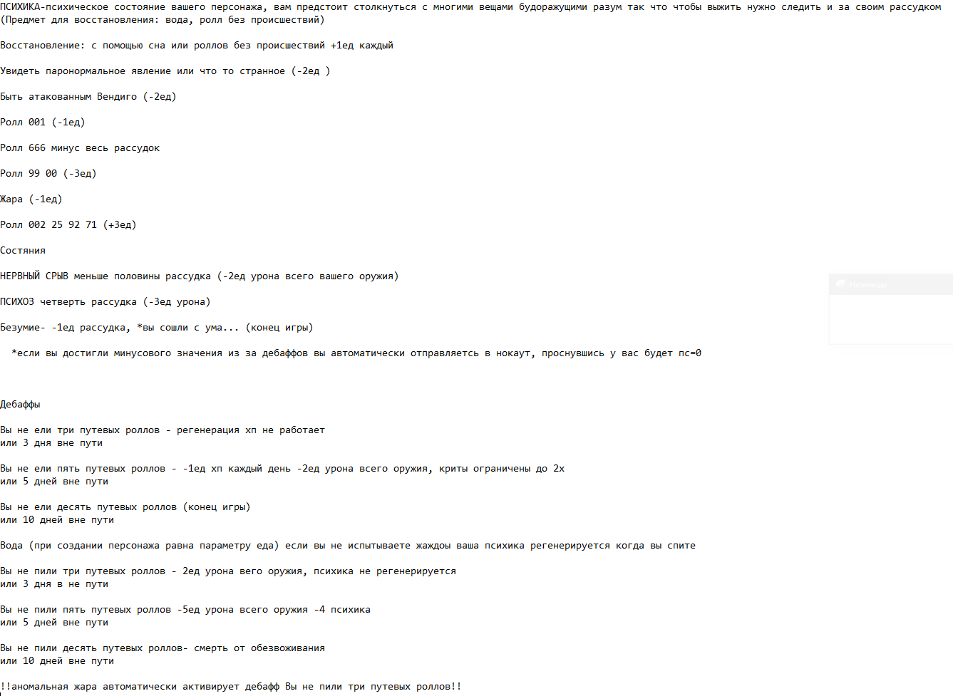 >>712051 >А как реализовать штраф на усталость? Штраф -1 к проверкам на успех пока персонаж не поспит минимум 8 часов.