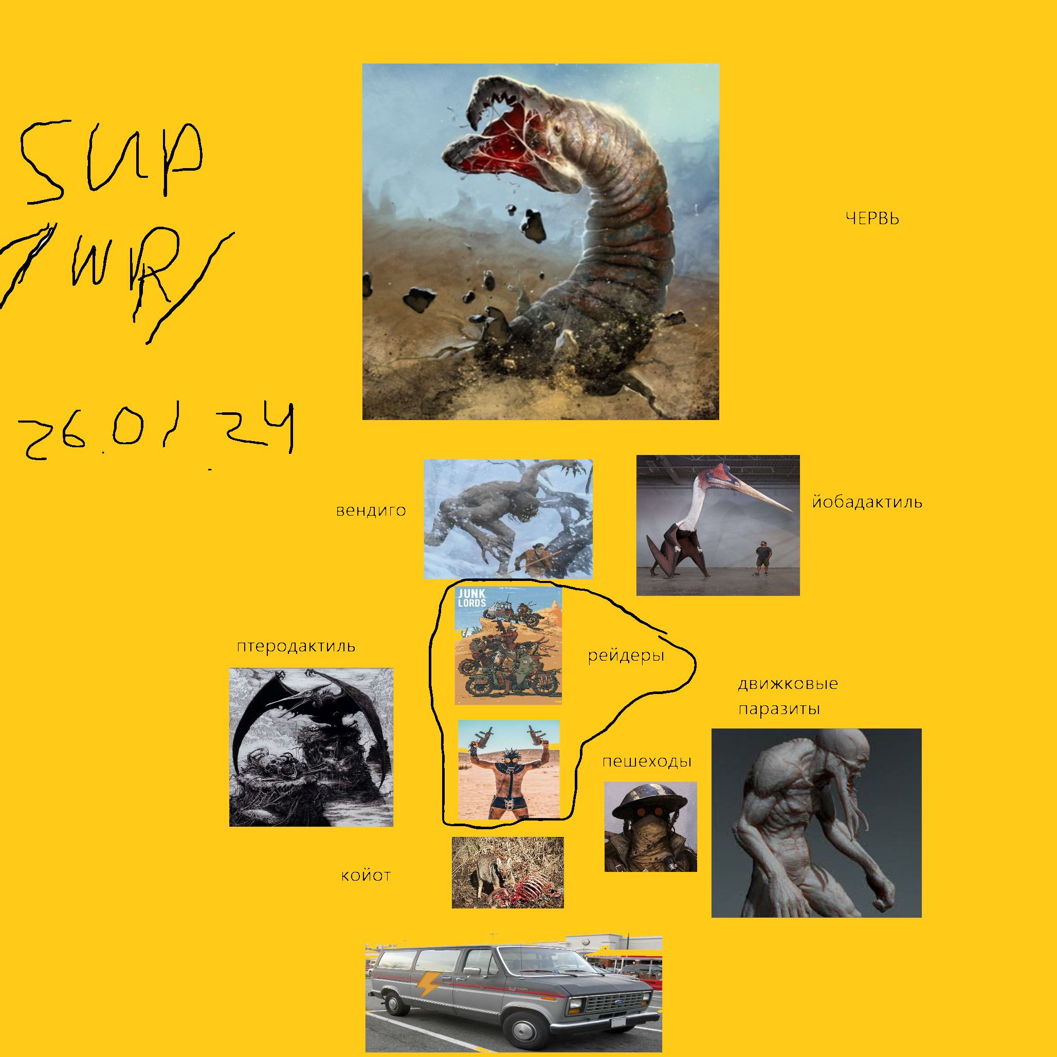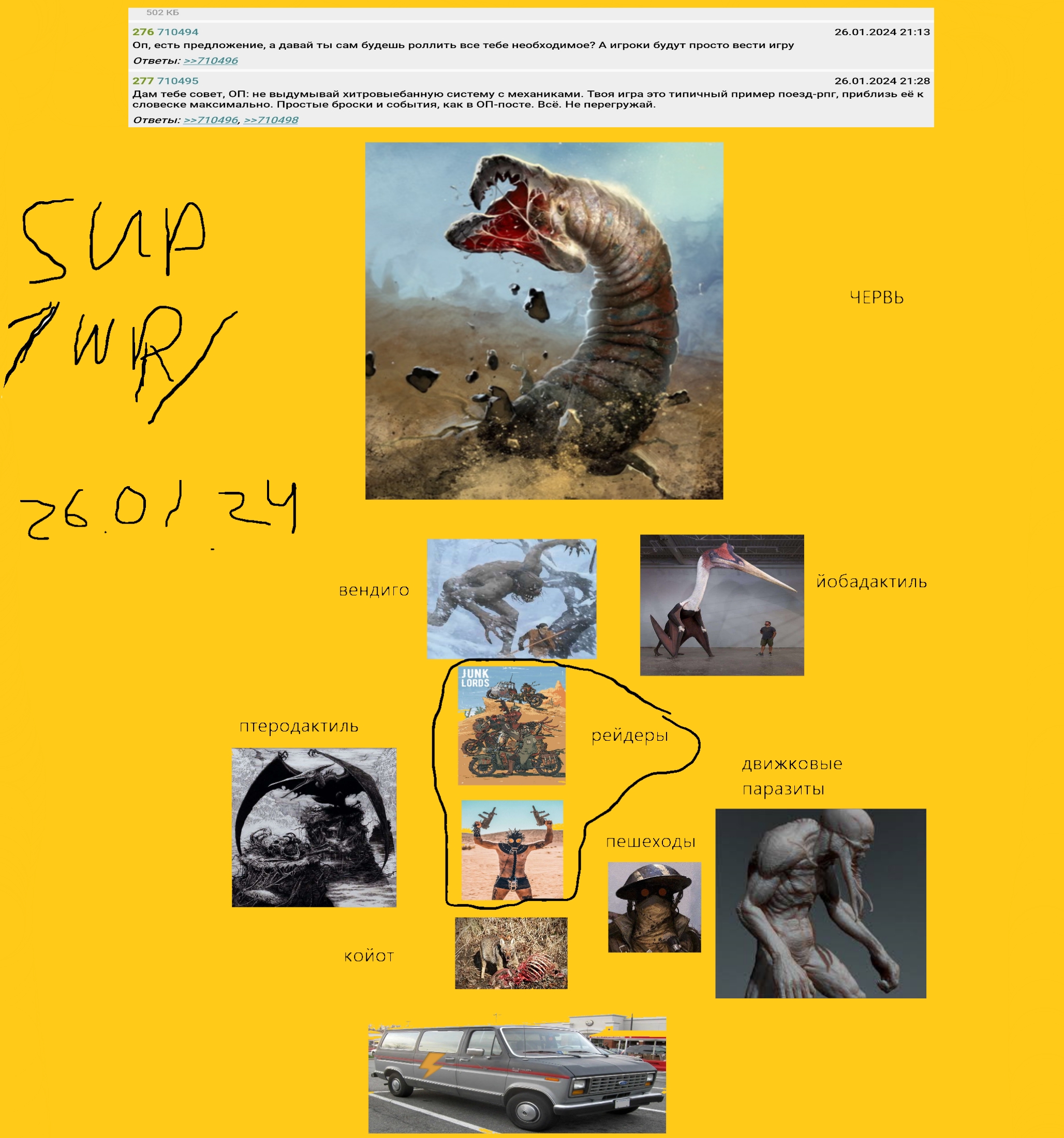 ФАУНА: 1. Койоты. Встречаются почти везде. Обычные блять койоты, мясо едят и срут. 2. Черви. Изначально они будут размером с змею, но к концу похода смогут сожрать фургон целиком. Их привлекают вибрации и перемещения песка. Слепы. 3. Рейдеры. Одичавшие люди, застрявшие тут навсегда. Новое поколение доходяг впринципе не знают про наш мир. Вооружены примитивной салютчаткой, холодным оружием и имеют угандошенный автотранспорт. Пользуются той же дорогой, что и ты, имеют свои секретные колеи в пустыне. Образуют поселения. 4. Птеродактили. Хищные летающие создания, живущие в стаях. Самые крупные особи способны поднять твой фургон в воздух. 5. Вендиго. Их привлекает звук движка и запах топлива. Невероятно опасны для неподготовленного человека. 6. Движковые паразиты. Тощие, невероятно гибкие гуманоиды, питающиеся топливом. Живут у остановок автотранспорта, цепляются за днище машины, пробивают топливный бак и лакомятся. В бою слабы, обычно убегают. 7. Пешеходы. Неизвестные в чёрных, грязных балахонах, идущие вдоль дороги. При виде машины поднимают палец вверх, прося подвезти. Позже машины находят пустыми, без ценных вещей и людей внутри.