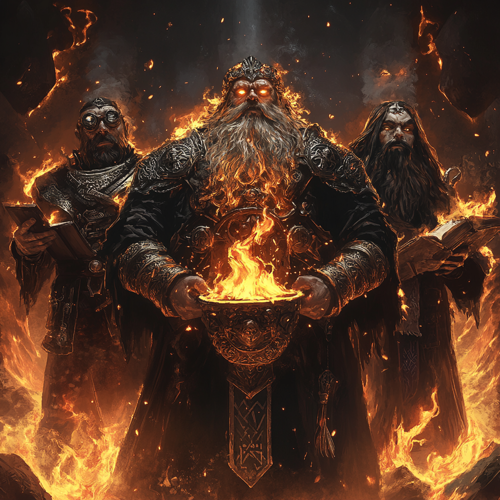 Как говорится, какой культ без лидеров. Гримнир Форджхолдер Гримнир — громадный дворф с бородой, увешанной обсидиановыми осколками, в массивных доспехах из черного железа, с пылающими огнем глазами. Он воплощает воинственную сущность культа, веря, что только огнем можно (и нужно) очистить мир. Гримнир - фанатик, считая убийства главным инструментом культа. Тиктус Алхимитектор Тиктус — гном с обожженной кожей и почерневшими руками, постоянно держащий в руках алхимические записки и скрывающий свои глаза за защитными очками. Он овладел искусством укрощения огня, превращая его в мощное оружие. Его одежда покрыта следами копоти и пахнет серой. Даззл Темный Шепот Даззл — худой низушек с длинными волосами, покрытыми пеплом и углем. Его глаза полны безумия, а одежды выглядят как обугленные лохмотья. В руках он держит древний фолиант, заполненный нечестивыми молитвами.
