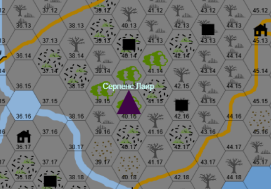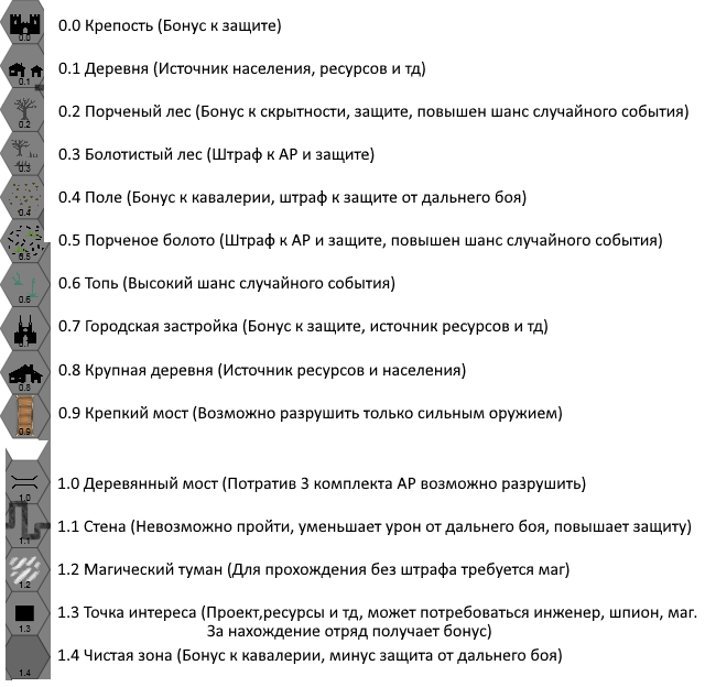 >>795352 Легенда карты (Не полная) 0.0 Крепость (Бонус к защите) 0.1 Деревня (Источник населения, ресурсов и тд) 0.2 Порченый лес (Бонус к скрытности, защите, повышен шанс случайного события) 0.3 Болотистый лес (Штраф к АР и защите) 0.4 Поле (Бонус к кавалерии, штраф к защите от дальнего боя) 0.5 Порченое болото (Штраф к АР и защите, повышен шанс случайного события) 0.6 Топь (Высокий шанс случайного события) 0.7 Городская застройка (Бонус к защите, источник ресурсов и тд) 0.8 Крупная деревня (Источник ресурсов и населения) 0.9 Крепкий мост (Возможно разрушить только сильным оружием) 1.0 Деревянный мост (Потратив 3 комплекта АР возможно разрушить) 1.1 Стена (Невозможно пройти, уменьшает урон от дальнего боя, повышает защиту) 1.2 Магический туман (Для прохождения без штрафа требуется маг) 1.3 Точка интереса (Проект,ресурсы и тд, может потребоваться инженер, шпион, маг. За нахождение отряд получает бонус) 1.4 Чистая зона (Бонус к кавалерии, минус защита от дальнего боя)