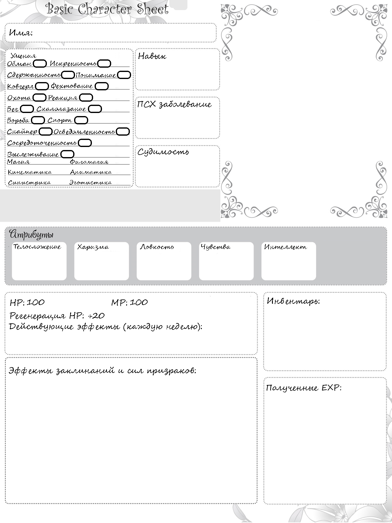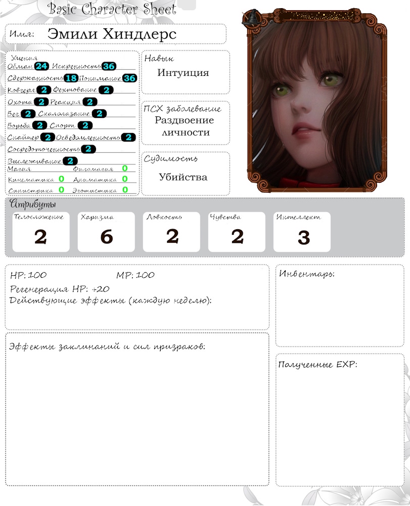 Так, девчули. Во первых, спасибо за посты, свои отпишу, как только чуть освобожусь. Во вторых, заполните пожалуйста чарлисты, чтобы не возникало путаниц. А то у половины игроков два варианта чарника ИТТ. Эмили, не забывай, что у тебя интеллект 3 и харизма 6. В инвентаре отписываются только ключевые вещи вроде магических компонентов и оружия, форму, бумаги и прочую мелочь туда вписывать не нужно.