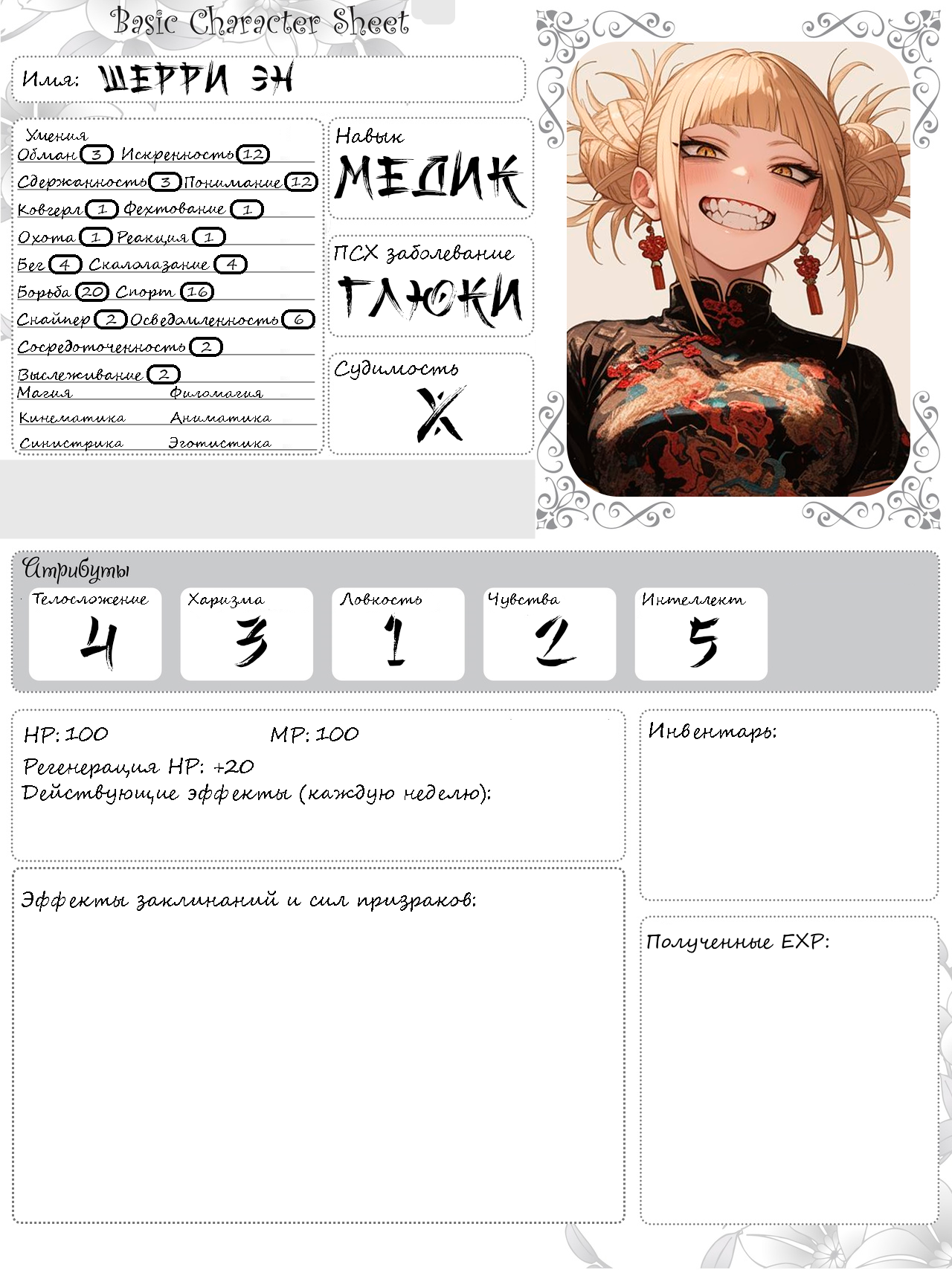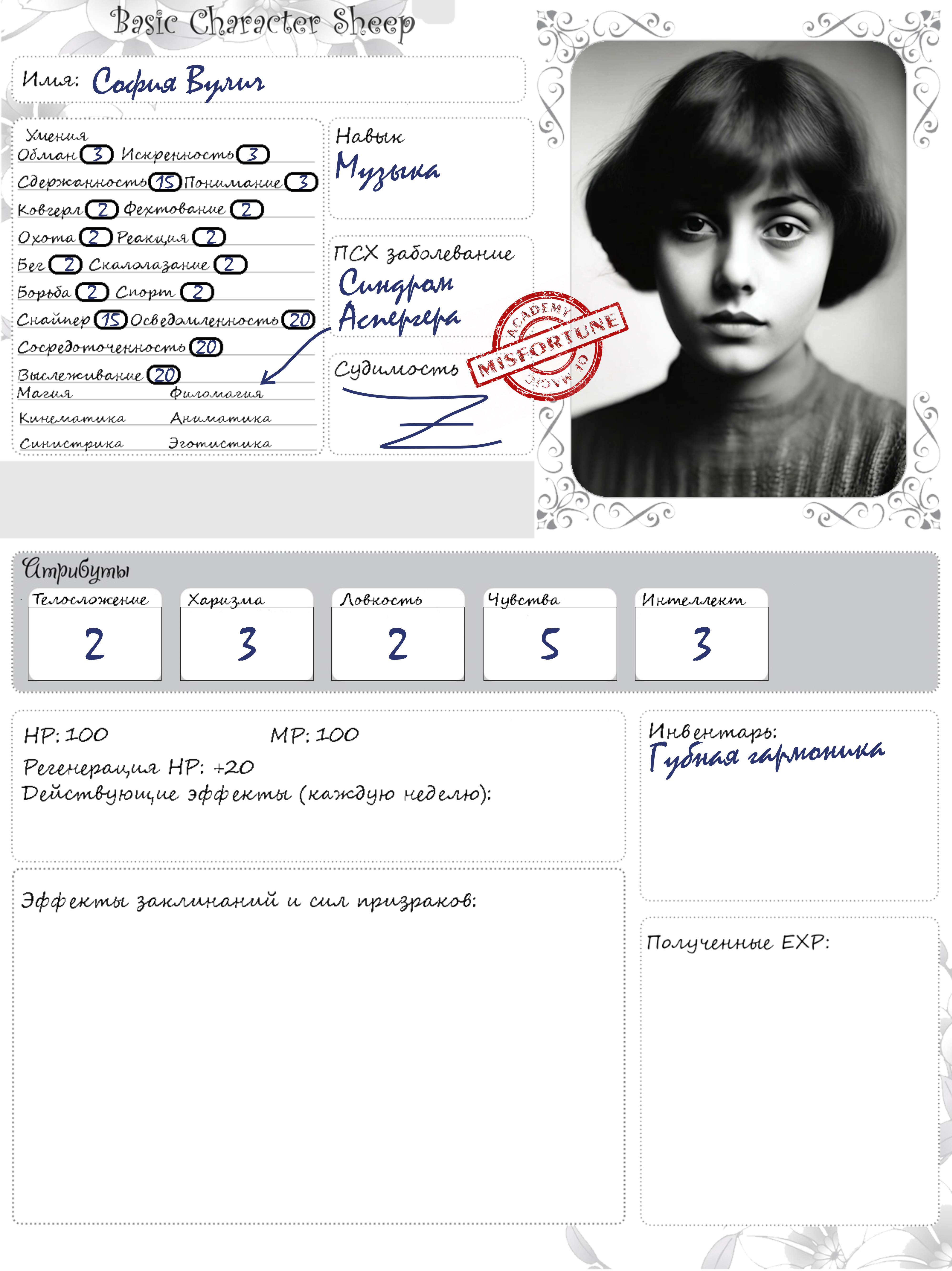 @ Психическое расстройство: синдром Аспергера (упор на филомагию) @ Специальный навык: музыка - Инструмент: губная гармоника, когда-то подаренная гарнизонным капельмейстером под обещание учить военные марши - Репертуар: военные марши Соня не имеет ни выраженных музыкальных способностей, ни нужного образования, всех результатов в этой области (как и большинстве других) она добивается упорной зубрежкой.