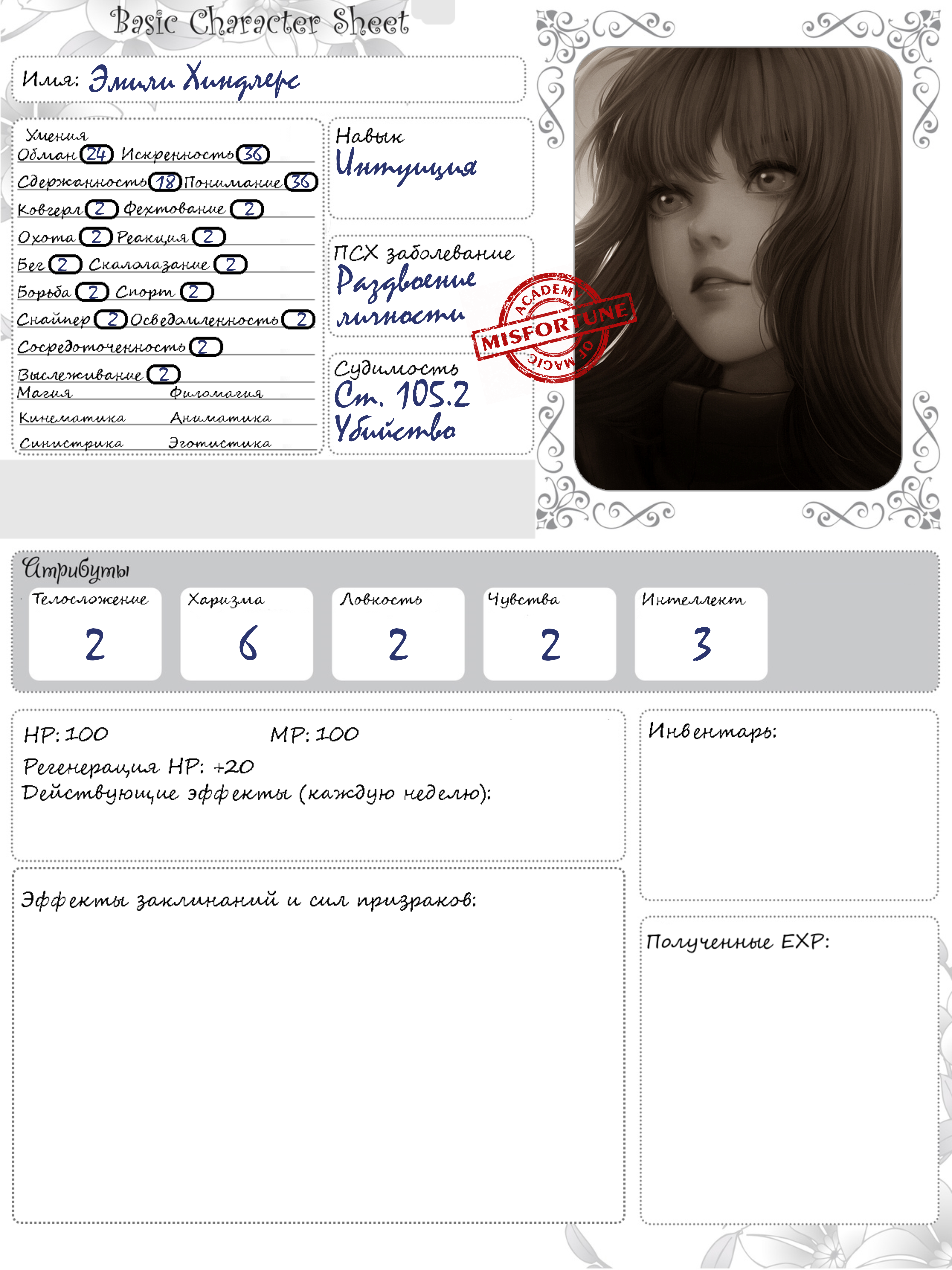 Есть ребята девчата два вопроса: места еще есть и какова цель? Сбежать? Дожить до выпускного? У меня есть мысля вкатиться либо сектанткой с галюнами, что записалась в Мисфорчен добровольно, чтоб навербовать в секту людей. Либо за ультра радикальную феминистку благородных кровей со статьей за терроризмгосизмену контрабанду. Эта будет пытаться устраивать акции аля Фемен и стремиться к революции в отдельно взятой школе. Но это все не точно.