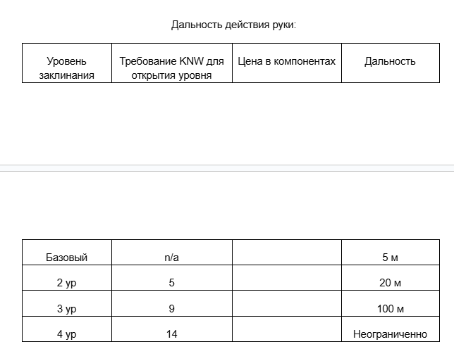 >>867278 Базовый уровень - это то, что ты получаешь при покупке заклинания. Тратишь только 6 KNW. Далее каждый уровень отдельно. Т.е. потратив ещё 6 KNW на 2 ур времени действия, ты сможешь поддерживать руку 5 минут вместо 30 секунд, но сила и радиус действия остаются на базовом уровне. Если хочешь, ты можешь купить за 11 очков базовое заклинание и 2 ур дальность действия, а если потратишь 11 очков и 2 бонусных от филомагии, то сможешь взять 2 ур на любой другой характеристике.