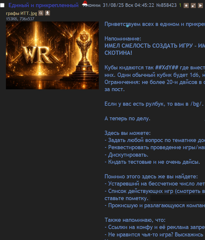 Помимо этого здесь же вы найдете: - Устаревший на бессчетное число лет лет FAQ http://2ch.hk/faq/faq_wr.html для мастеров и игроков. - Список действующих игр (смотреть в постах с темой "Список игр"). Обычно его пишут аноны. Аноны, которые пишут - ставьте пометку. На деле всем похуй, хотя поворчать на отсутствие обзоров любят. - Прокисшую и разлагающуюся компанию.