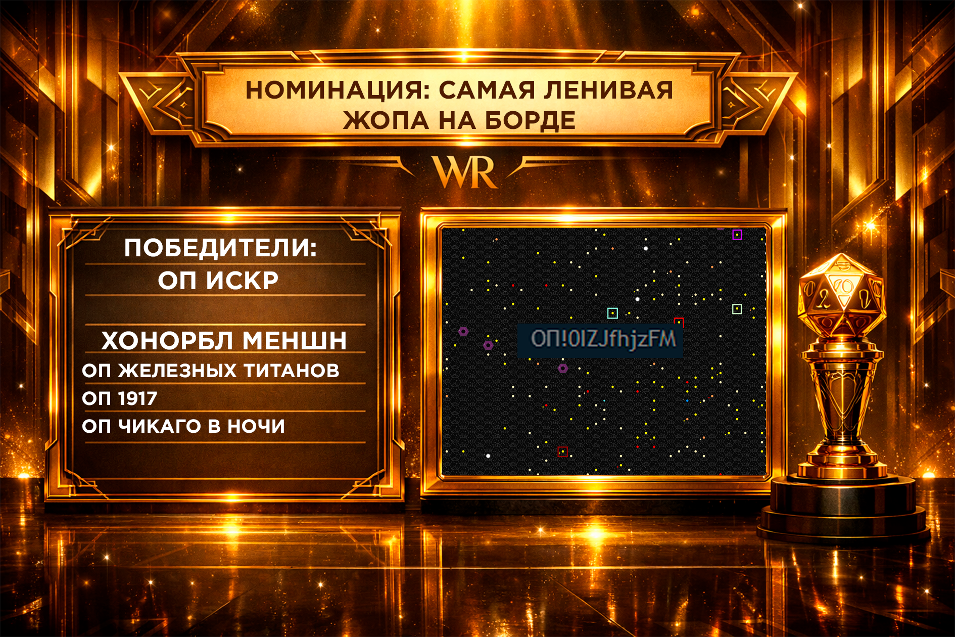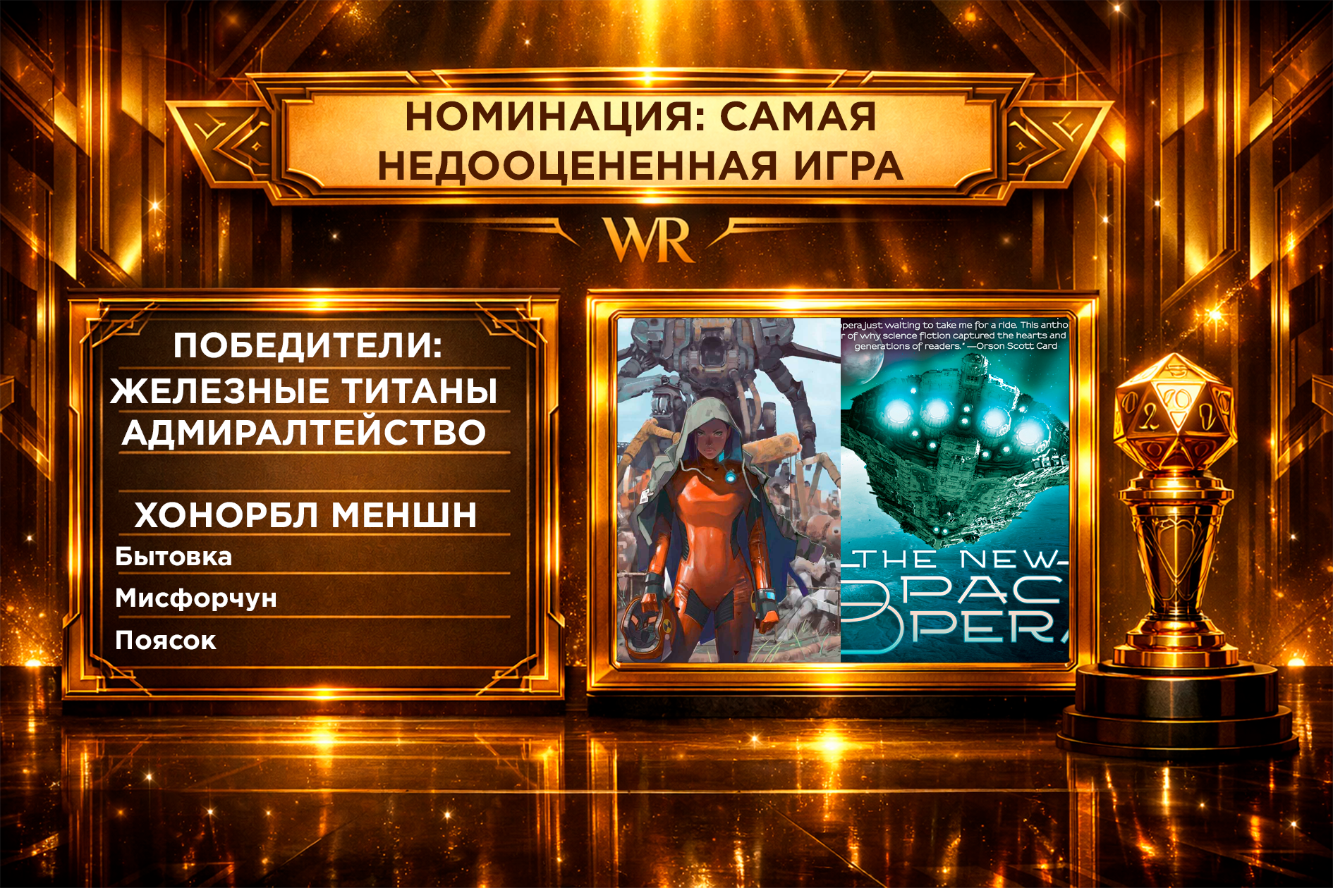 НОМИНАЦИЯ: САМАЯ НЕДООЦЕНЕННАЯ ИГРА Игра, которая заслуживала большего внимания, но прошла мимо основной массы анонов. Странная или просто не вовремя появившаяся - но всё равно достойная. ПОБЕДИТЕЛЬ: ЖЕЛЕЗНЫЕ ТИТАНЫ, АДМИРАЛТЕЙСТВО Комментарий ведущего: в основе титанов, стоит признать, лежал хороший форк лансера, а Адмиралтейство, несмотря на долгую кому, в конце 2025 года стало вновь подавать признаки жизни.