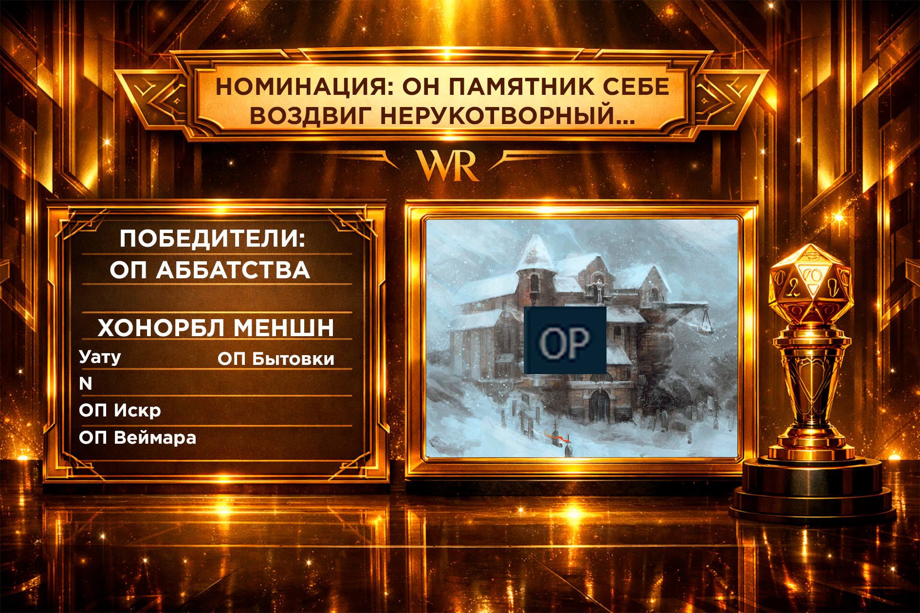 НОМИНАЦИЯ: ОТКРЫТИЕ ГОДА Неожиданная находка года - новая система, кампания или идея, от которой никто ничего не ждал, а зря. Игра, которая приятно (или не очень) удивила и оставила свой след. ПОБЕДИТЕЛЬ: ВЕЙМАР, МИСФОРЧЕН Комментарий ведущего: аналогично, голоса распределились поровну между двумя играми. Будем считать - что Веймар - действительно открывший полу-жанр игр тайл, а Мисфорчен - качественная и хорошая игра, аж настолько, что стала открытием для WR. Думайте.