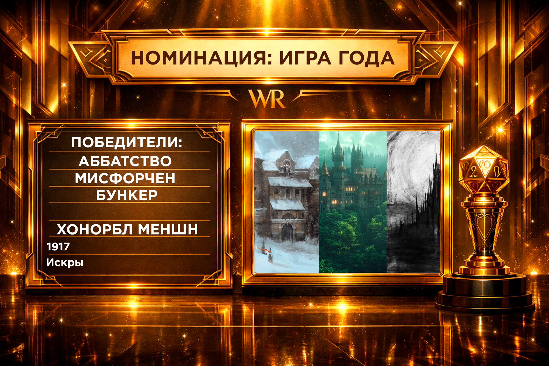 НОМИНАЦИЯ: ИГРА ГОДА Игра, которая стала главным событием года: обсуждалась, порождала треды и запоминалась. Та самая, про которую говорили: "вот ради этого я и сижу на /wr". ПОБЕДИТЕЛЬ: АББАТСТВО, МИСФОРЧЕН, БУНКЕР Комментарий ведущего: голоса распределились поровну между тремя претендентами. Можно было бы зачесть бункер и аббатство как единый тайтл, но судьбы у игр разные. Чтобы не устраивать судейские подтасовки и не проводить еще один раунд голосования, было принято решение дать статус "игры года" всем трем играм.