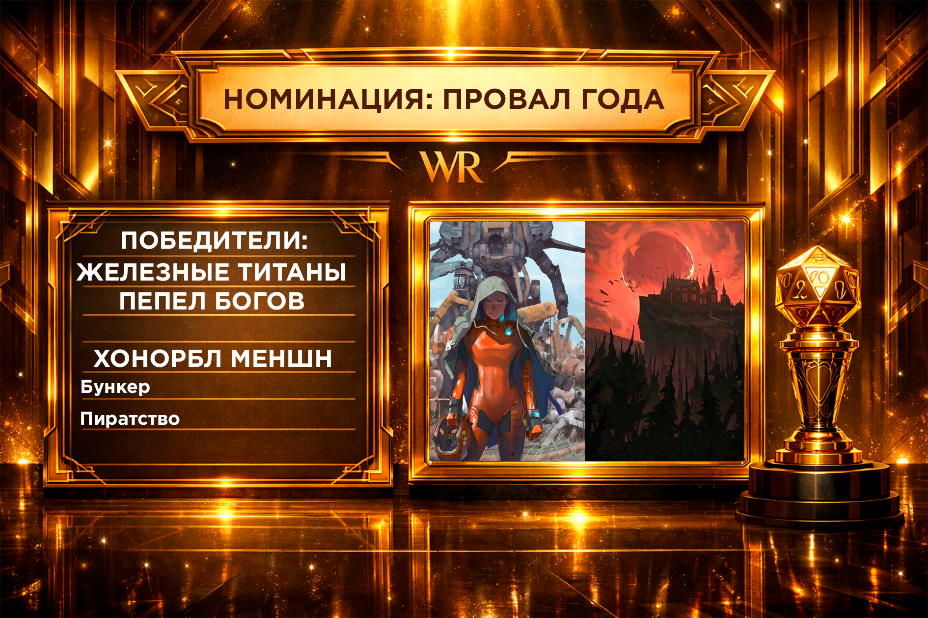 НОМИНАЦИЯ: ПРОВАЛ ГОДА Громкое начинание, которое не оправдалось. Игра, у которой было всё, кроме результата: дропы, срачи и разочарование. ПОБЕДИТЕЛЬ: ЖЕЛЕЗНЫЕ ТИТАНЫ, ПЕПЕЛ БОГОВ Комментарий ведущего: аналогично, голоса распределились поровну между двумя играми. Увы, если аристократство породило несколько мемов и продержалось некоторое время на чатике братьев игроков, то Железные титаны, несмотря на перезапуск, так и не подавали признаков жизни с самого старта игры.