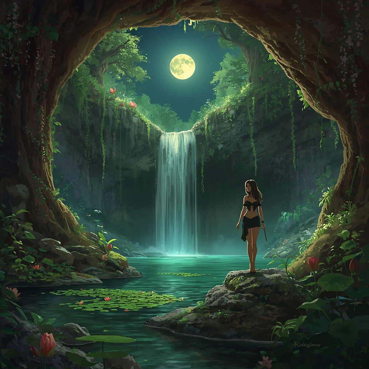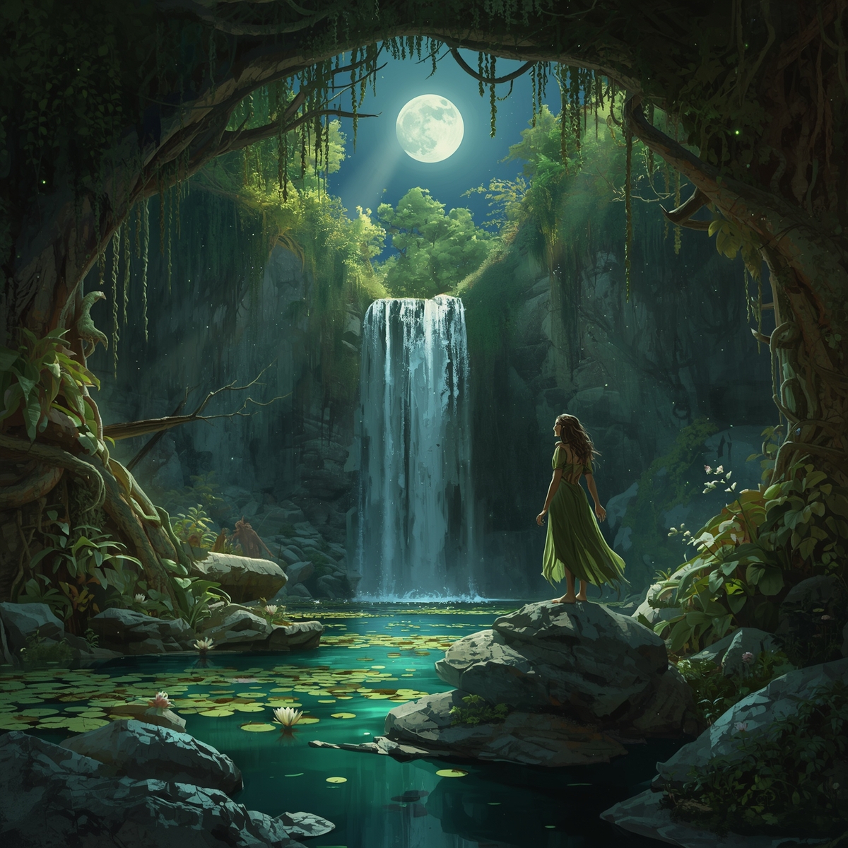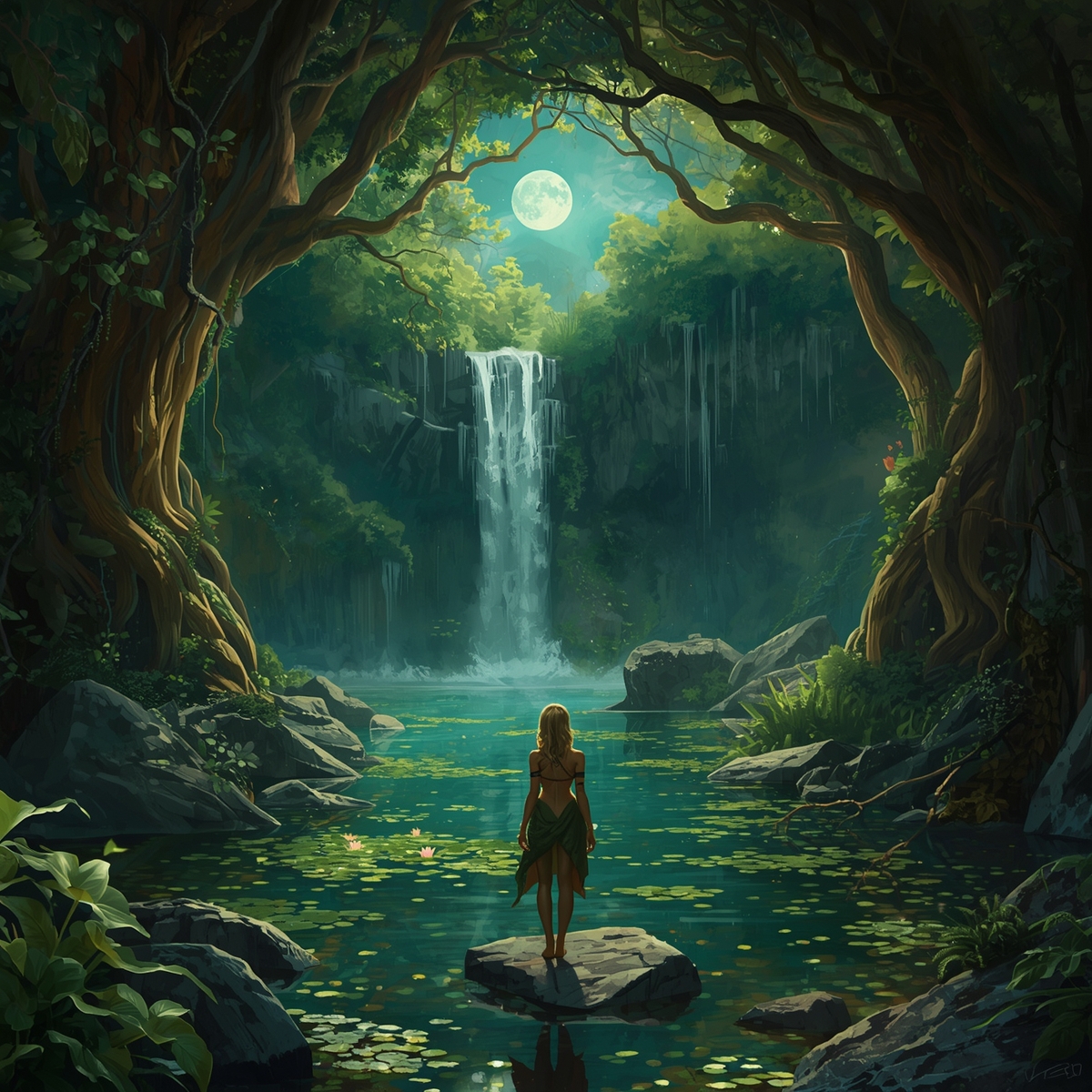 В центре этого всего была Шаэлин, стоящая босыми ногами на камне, а вода омывала ее ступни. Нимфа медленно воздела руки к луне, и лучи светила ударили с удвоенной силой прямо в глубину воды, отчего кувшинки засветились ярче и откуда-то из под глади раздался тихий перезвон и теплый смех русалок.