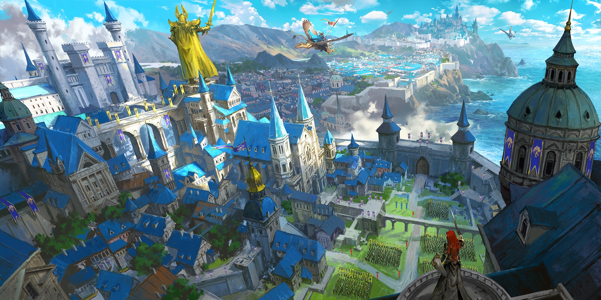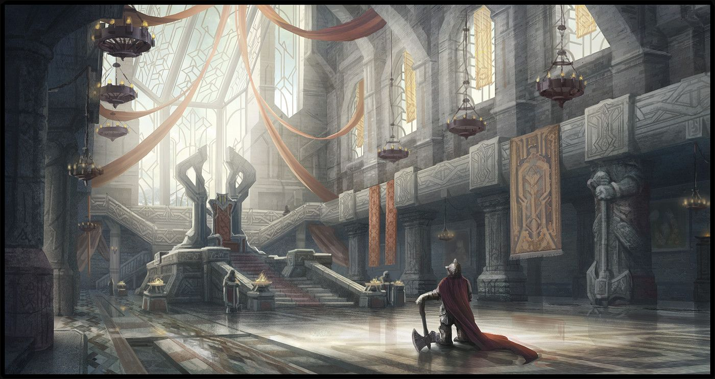 Исполинские двустворчатые двери из тысячелетней морёной секвойи, инкрустированные самородками из Зольтенбрау и костями последнего пурпурного дракона, гулко закрылись за семёркой почётных гостей. Вышколенные стражники с немигающими бесстрастными взглядами подняли алебарды на караул. Тронный зал встретил их приятной прохладой сквозняков, эхом от стука каблуков, шёпотом плетущихся интриг и экзотическим букетом раскуренных благовоний — щедрых даров Бракадского султана. Высокие своды его почти исчезали в полумраке, лишь огоньки хитроумно устроенной системы жарко горевших масляных лампад отражались на ликах героев эпоса, украшавших потолок. Подпиравшие его колонны были украшены резными фигурами мифических существ. Дневной свет, пробиваясь сквозь мозаику пёстрых витражей, растекался по гранитным плитам подобно богатому ковру. Драпированные сине-белым сукном стены украшались множеством военных трофеев подзабытых войн — были тут и расколотые шлемы титанов, и хоругви поверженных врагов, и ключи от взятых столиц, и артефакты непонятной беглому взгляду природы вроде источающих без всякой подпитки перламутровый свет кристаллов. Массивный трон под пышным балдахином тех же бело-синих королевских цветов возвышался на трёх массивных ступенях в глубине зала, окружённый настенными канделябрами. Венчающий его спинку золотой грифон вставал на дыбы и хищно вглядывался в привычных просителей милости его Величества. Однако сегодня просить о помощи предстояло ему.