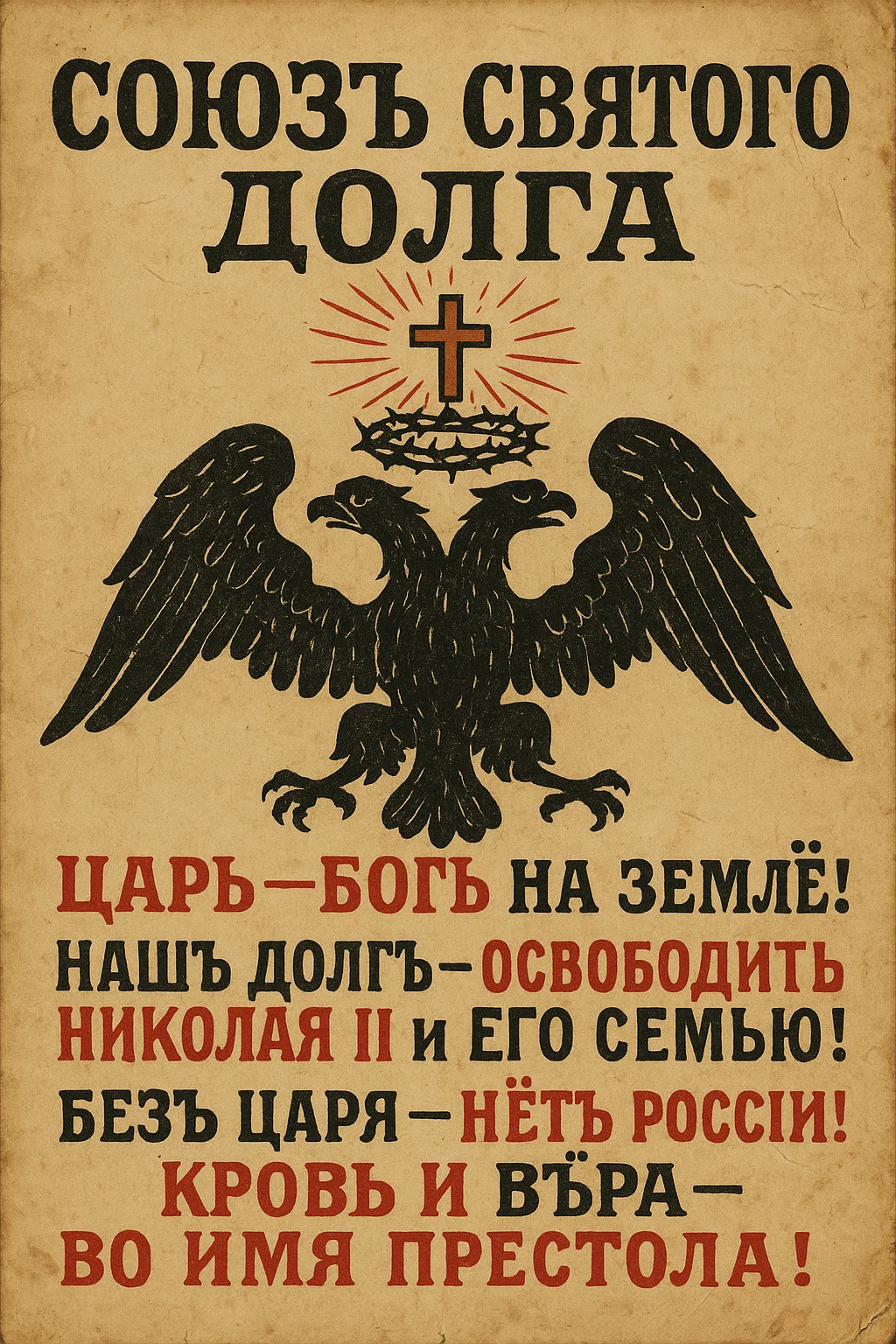 1. Идеологическая основа и цели Ключевая идеология: радикальный монархизм, религиозный фанатизм, культ «Бога-Царя». Отречение Николая II трактуется как насильное духовное «богоотречение» России. Главная политическая цель: восстановление самодержавной православной монархии и возвращение Николая II и его семьи на трон. Краткосрочные цели (2–3 месяца): - создать устойчивые «Братства Долга» среди фронтовиков; - развернуть подпольную сеть слухов и агитации; - начать кампанию террора против большевиков и левых агитаторов; - добиться поддержки офицерских клубов и буржуазных доноров в Петрограде и Москве.